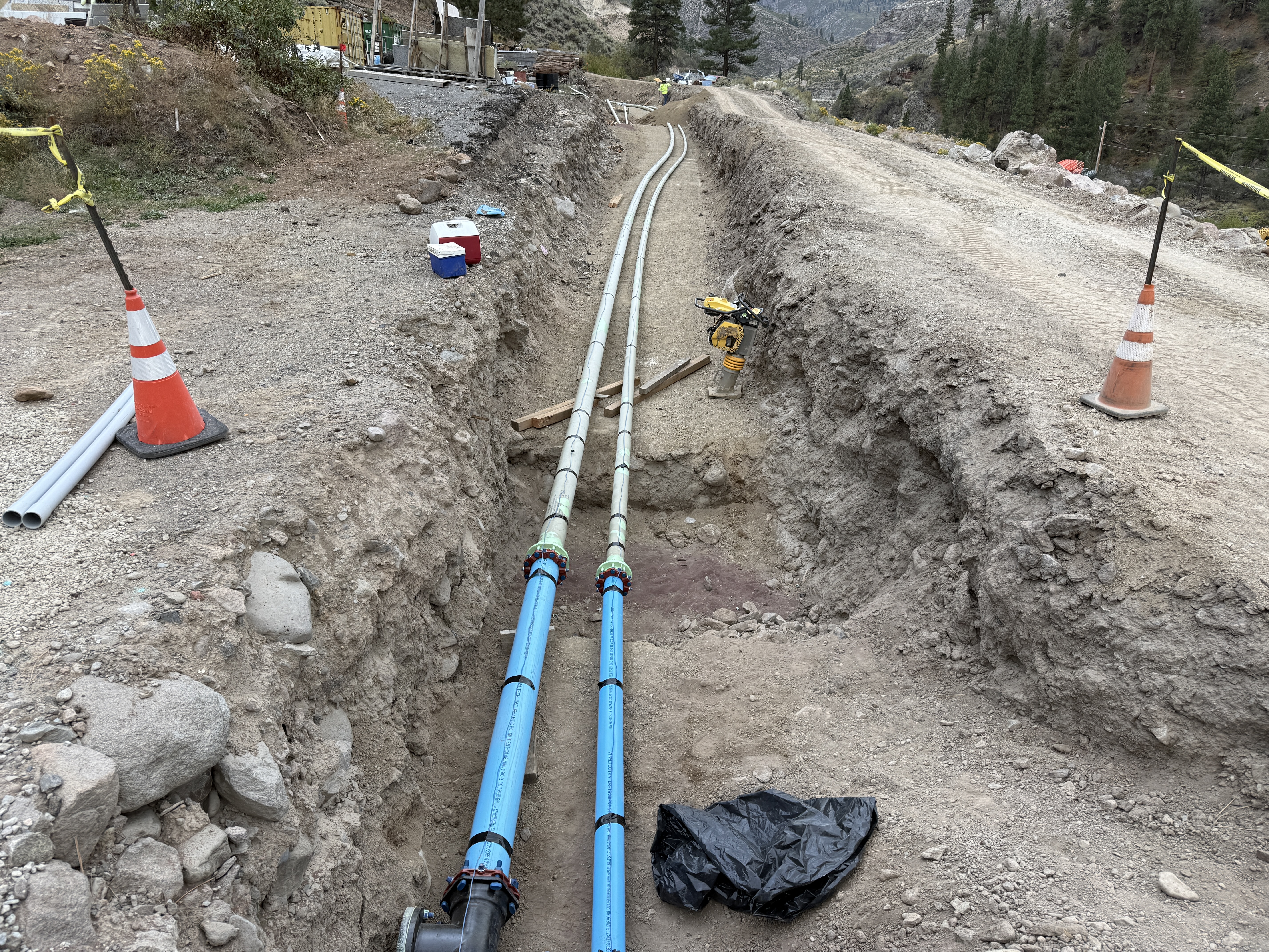 The image shows a trench with two blue pipes laid out in parallel. There are cones marking boundaries, and a compaction tool is present near the trench. The area appears to be part of a construction site in a rural setting. There are no visible workers in the photo.