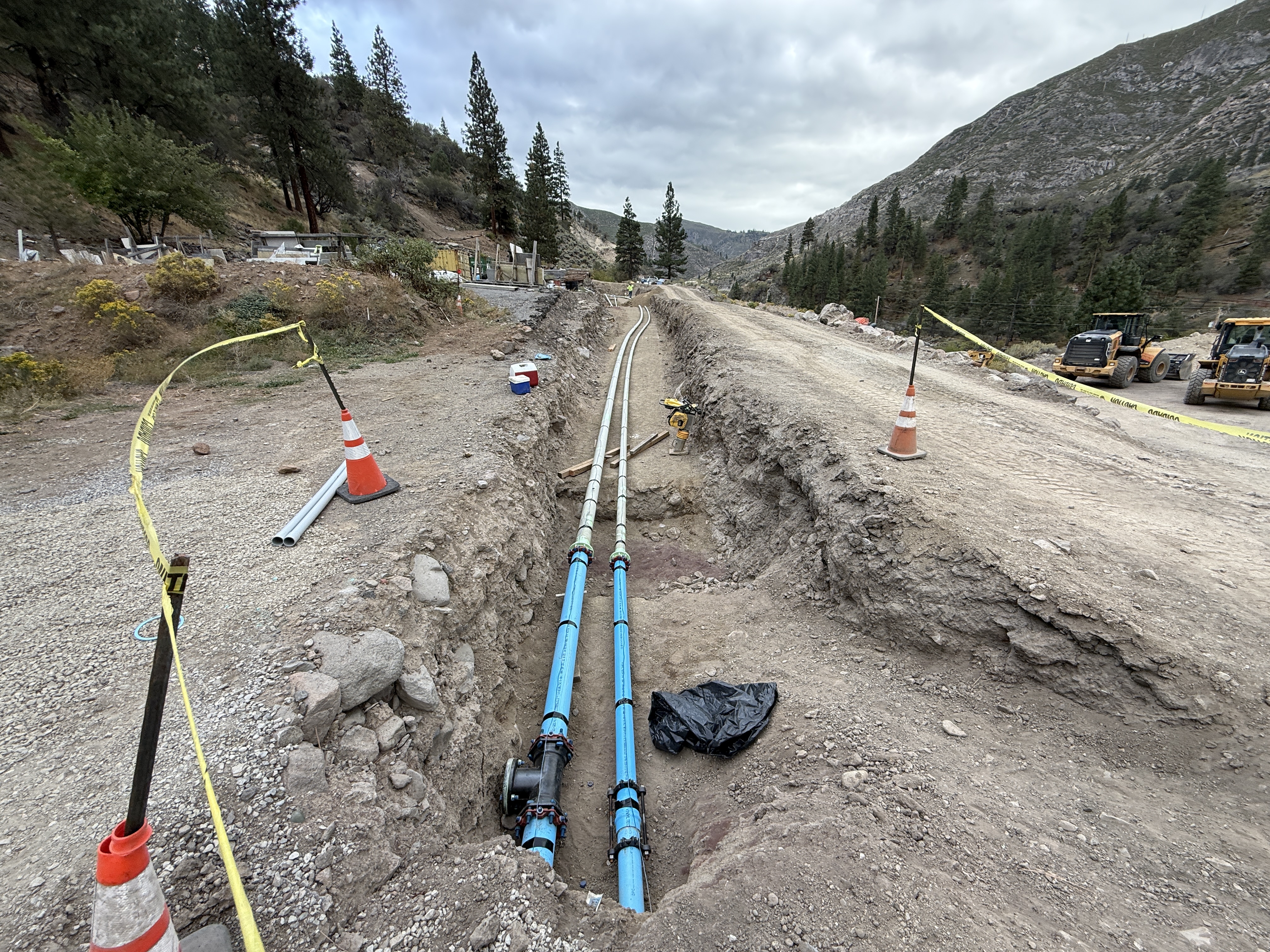 The image shows a trench with blue pipes installed along its length, suggesting active pipeline installation. Cones and caution tape are positioned along the trench, indicating an ongoing work zone. The trench runs parallel to a dirt road with heavy equipment staged nearby. Surrounding the trench are rocky soil conditions, typical of excavation sites.
