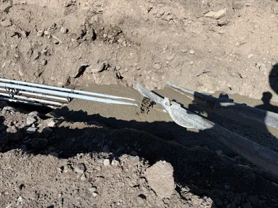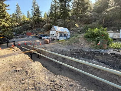 PPE such as hard hats, hi-vis vests, and work boots are visible; open trenches are present.