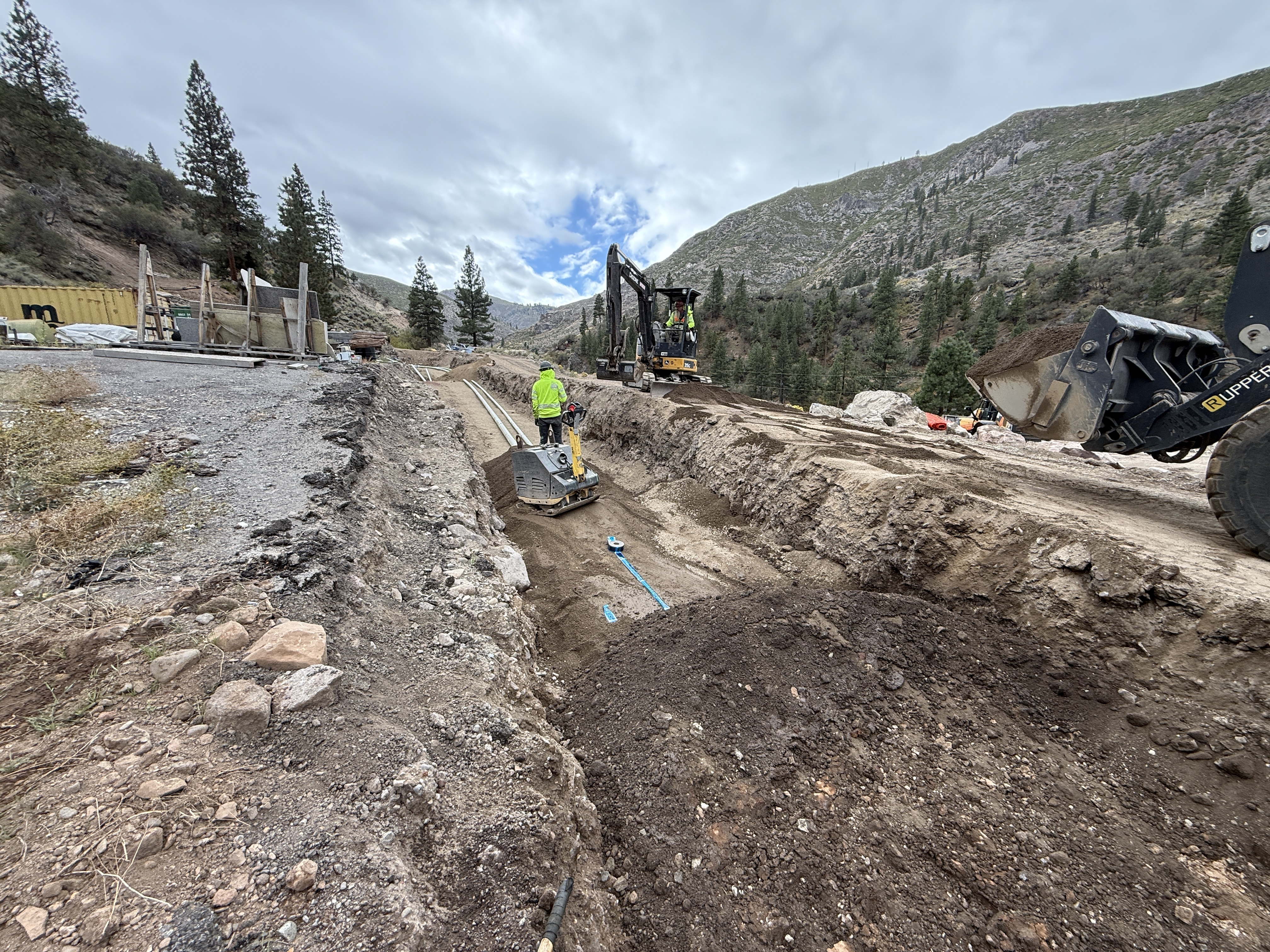 The image shows a trenching operation in a hilly environment with workers operating heavy machinery. A vibratory plate compactor is in use within the trench, and an excavator operates nearby. The trench appears freshly dug with pipes visible at the bottom. The environment is mountainous, and the area is surrounded by trees.