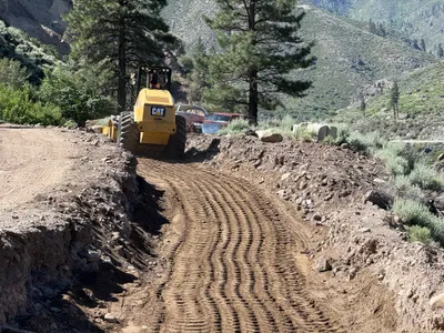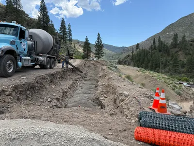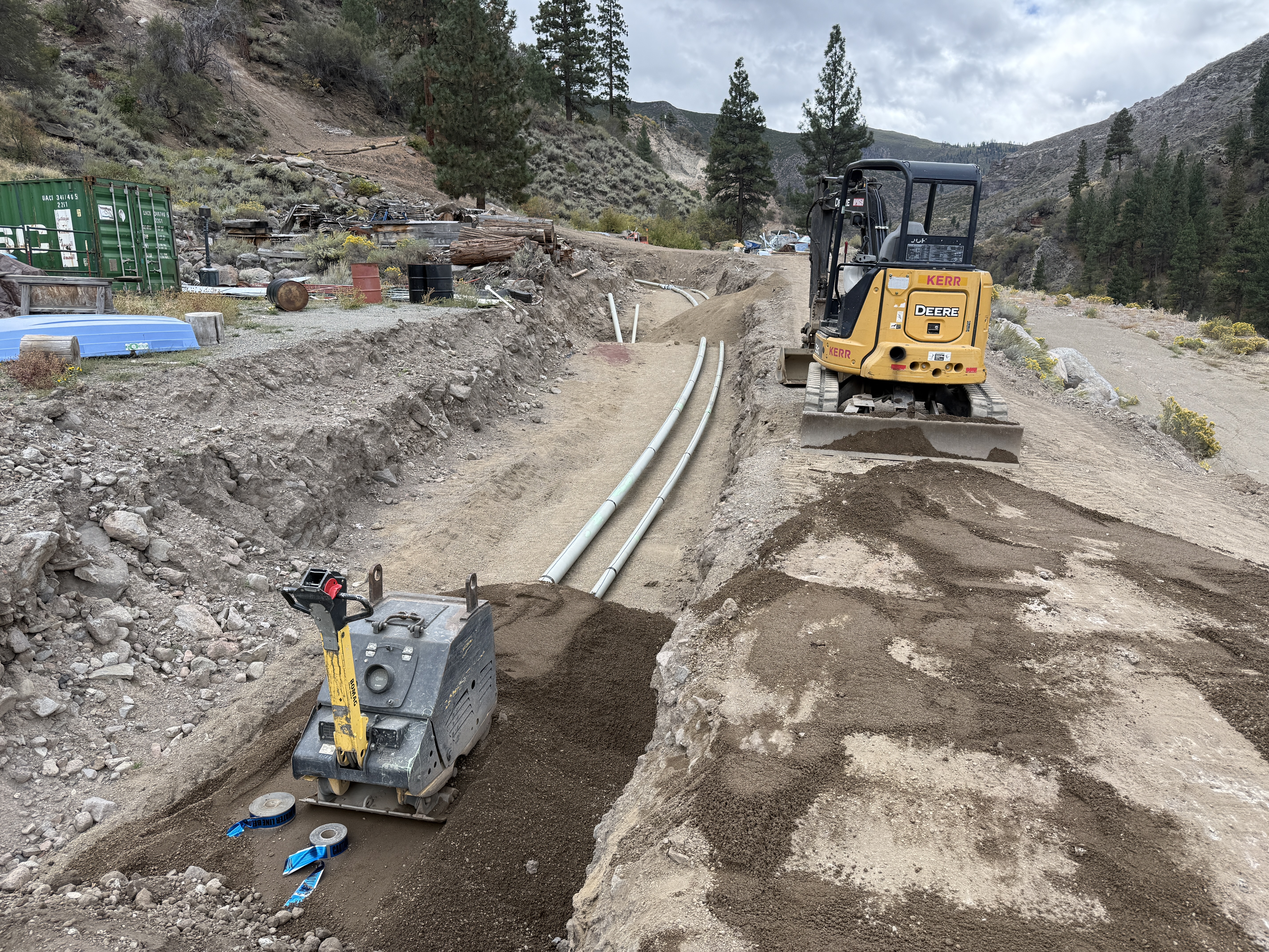 trench with soil backfill overcast daylight equipment positioned on loose soil surface