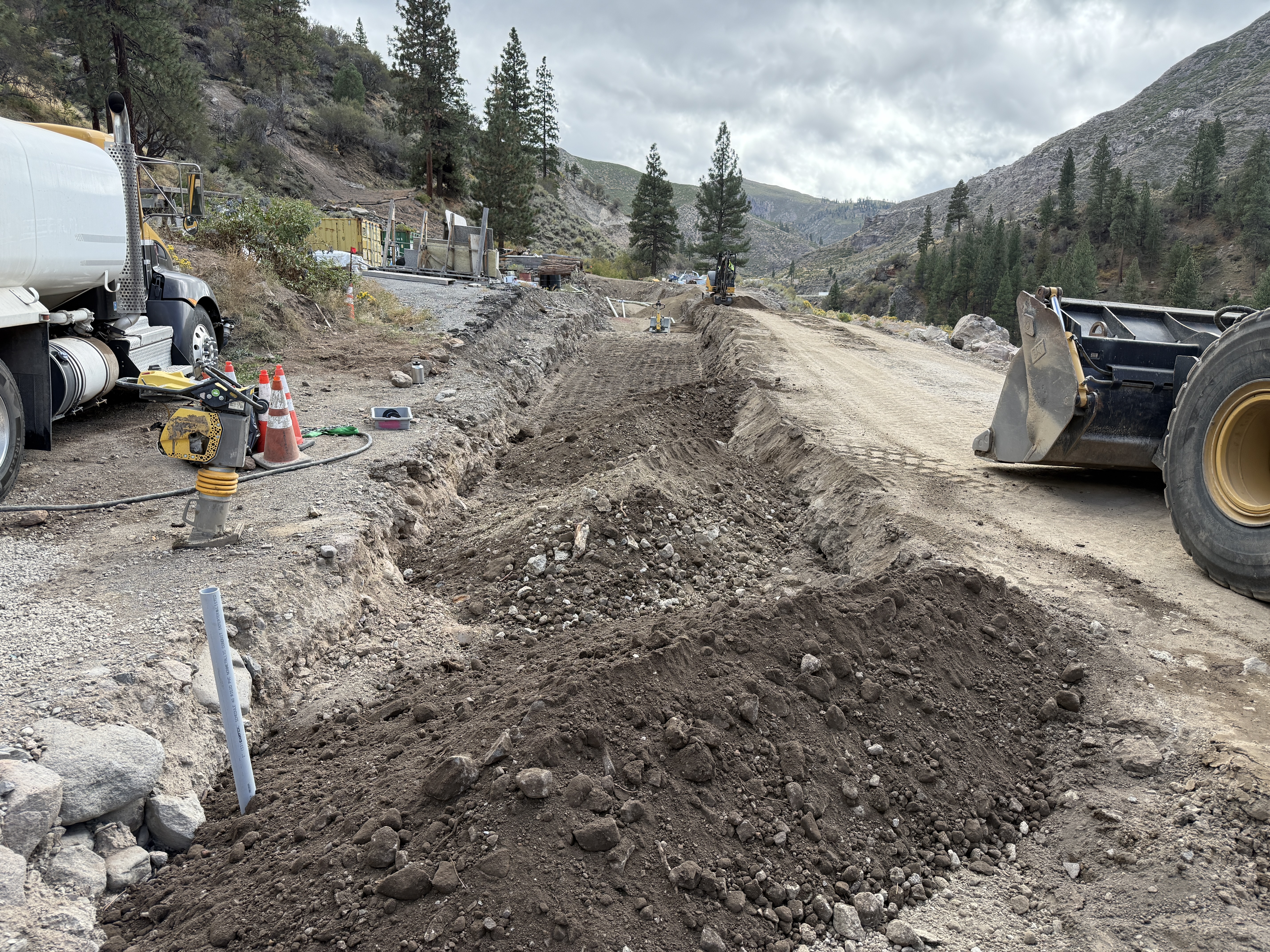 A trench is visible running alongside a dirt roadway with soil piled beside it. A compactor is visible near the trench, a truck is parked along the site, and a loader is positioned on the roadway. The area shows evidence of ongoing excavation work. The landscape is mountainous with scattered trees, and cloudy skies are present.