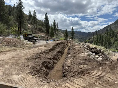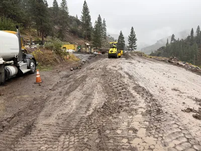 Traffic cones are visible as part of traffic control, but no PPE worn by workers is visible.