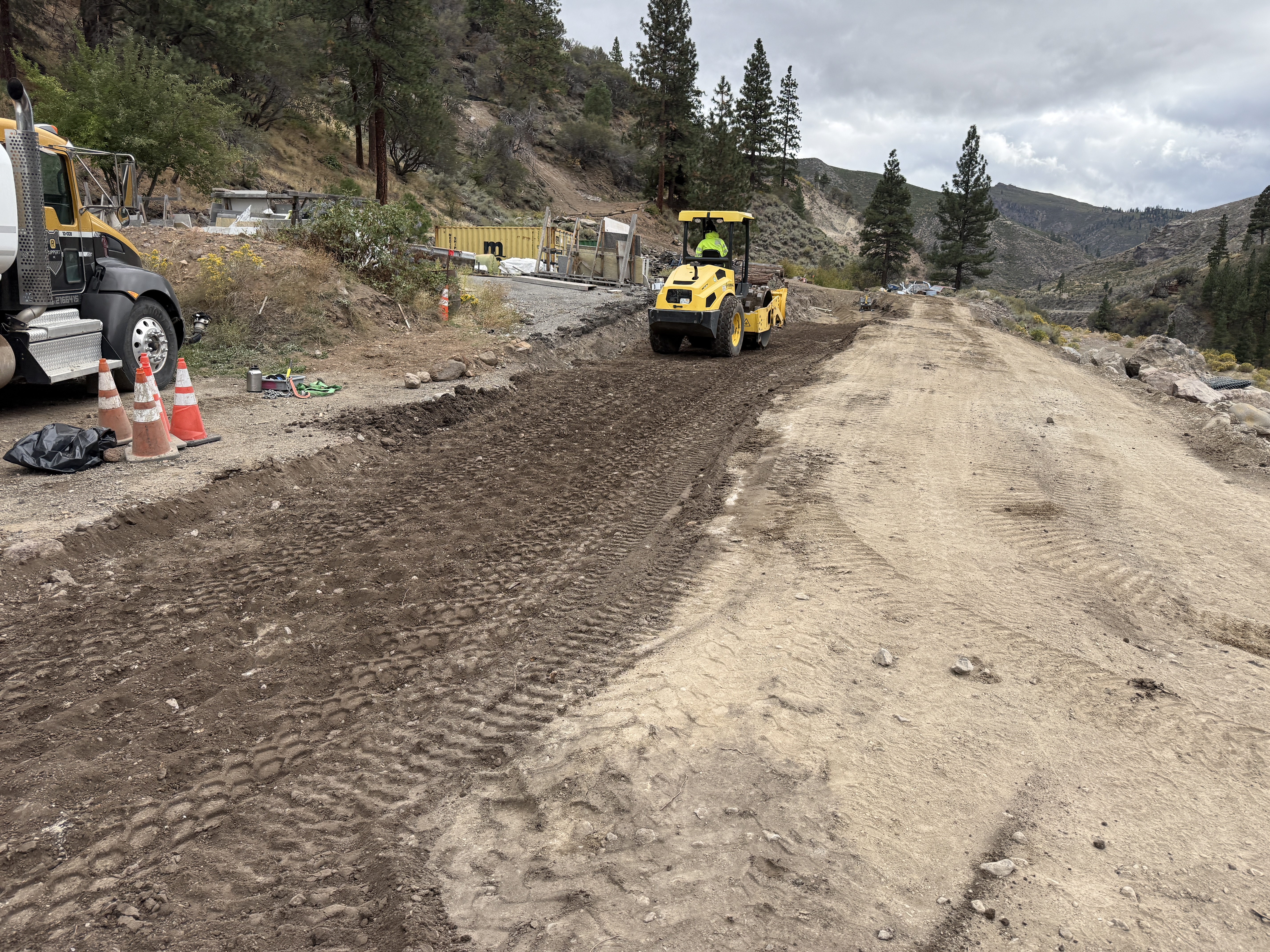 A yellow roller compactor is actively compacting a section of a dirt road on the right side. Traffic cones are positioned along the left side near a parked truck. The road surface shows tire impressions, and the landscape is mountainous with scattered trees. No evidence of pipeline or steel pipe work is visible.
