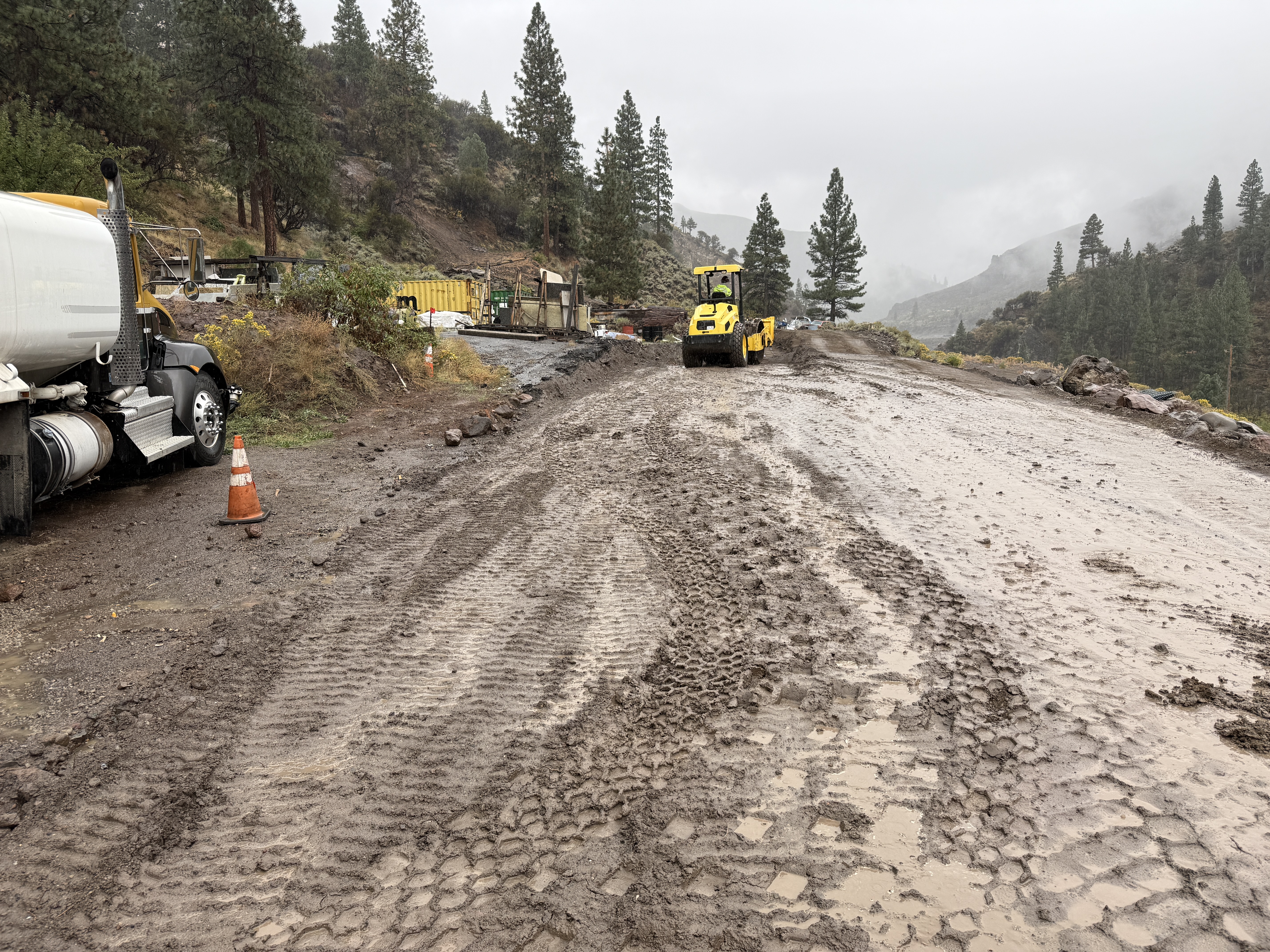 The image shows a roller compactor operating on a graded dirt road with visible mud and water accumulation. To the left, a water truck is parked with traffic cones around it. The background displays a hillside with trees and some construction material or equipment storage. The scene suggests ongoing surface work under overcast weather conditions.