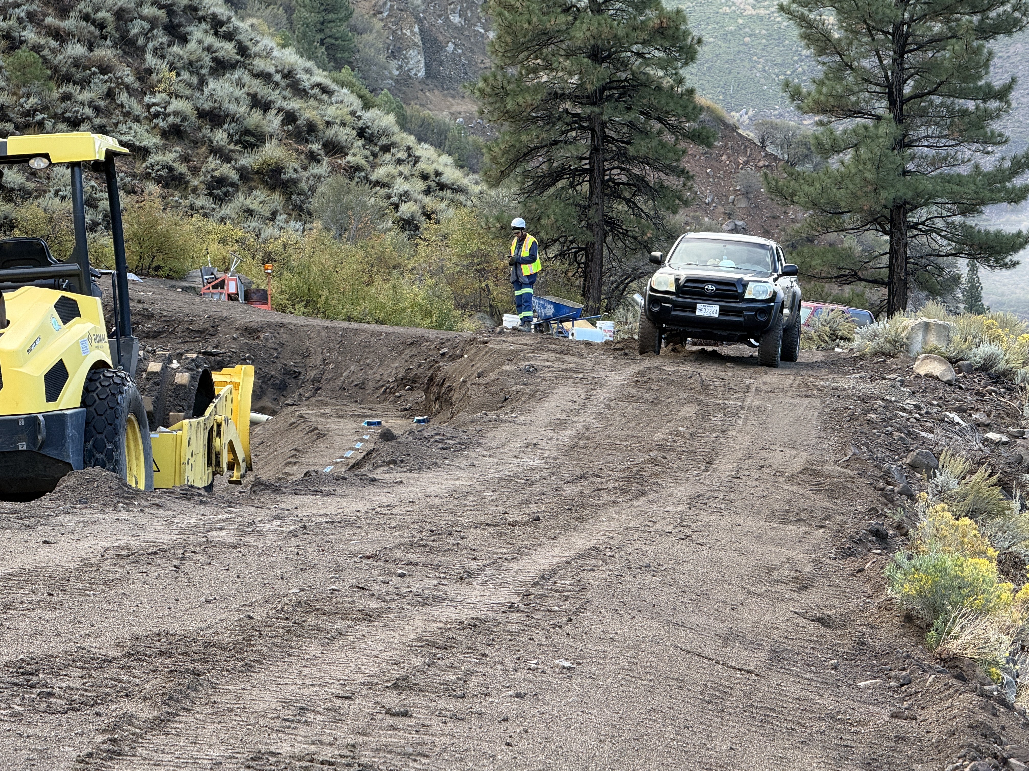 The image shows a construction worker standing near a trench in a dirt road with a yellow compactor positioned on the left side. A black pickup truck is parked on the right, further down the road. Some materials are visible near the trench, along with markings indicating pipe placements. The environment is a mix of dirt and sparse vegetation, and the site appears to be in a rural, mountainous area.