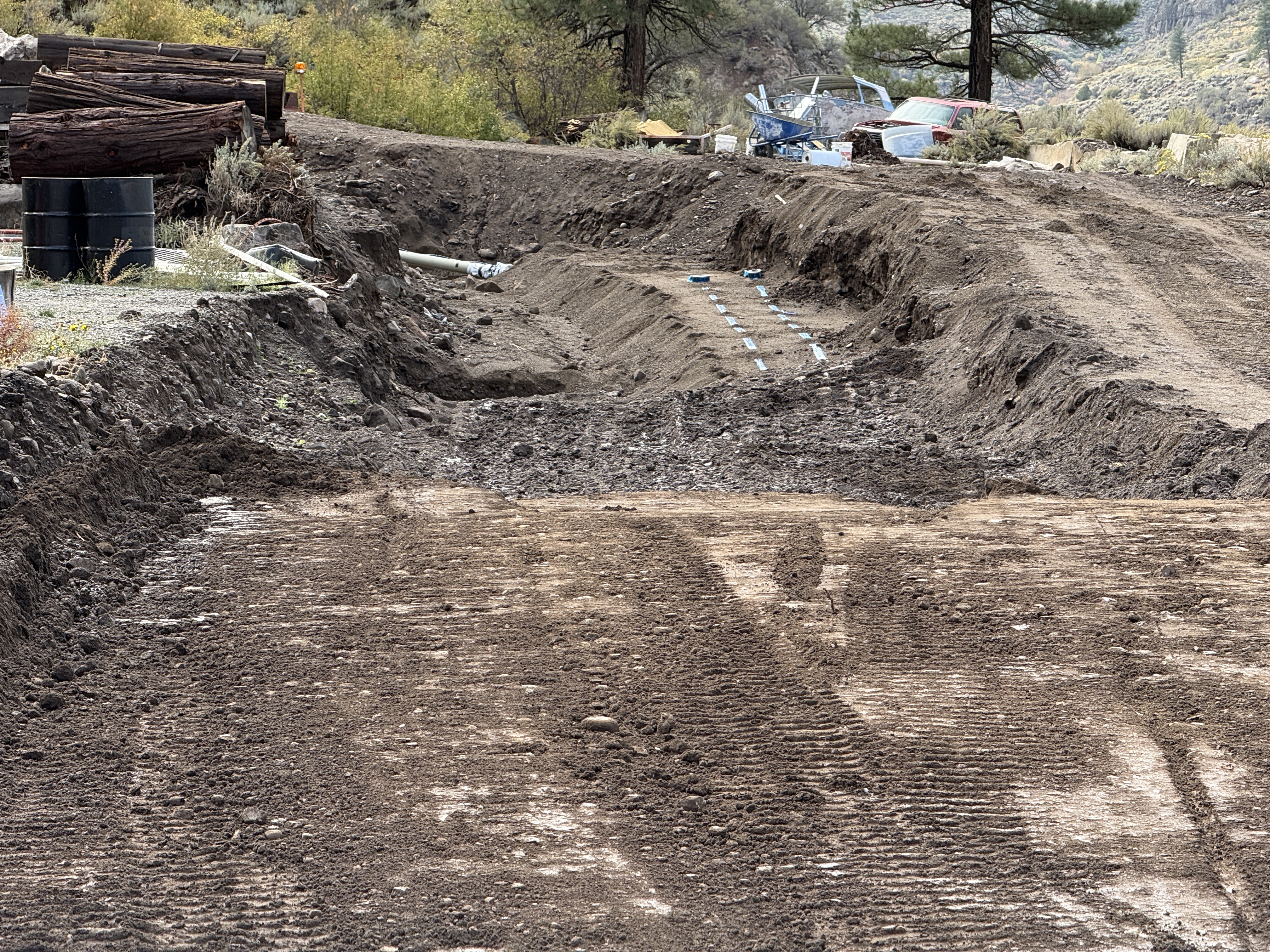 The image shows a trench dug along a dirt path with visible tracks from machinery or vehicles. To the side of the trench, several pipes are seen laid out, suggesting preparation or ongoing installation. Timber and other construction materials are piled to the left, and several vehicles are parked further back, providing context for an active work site.