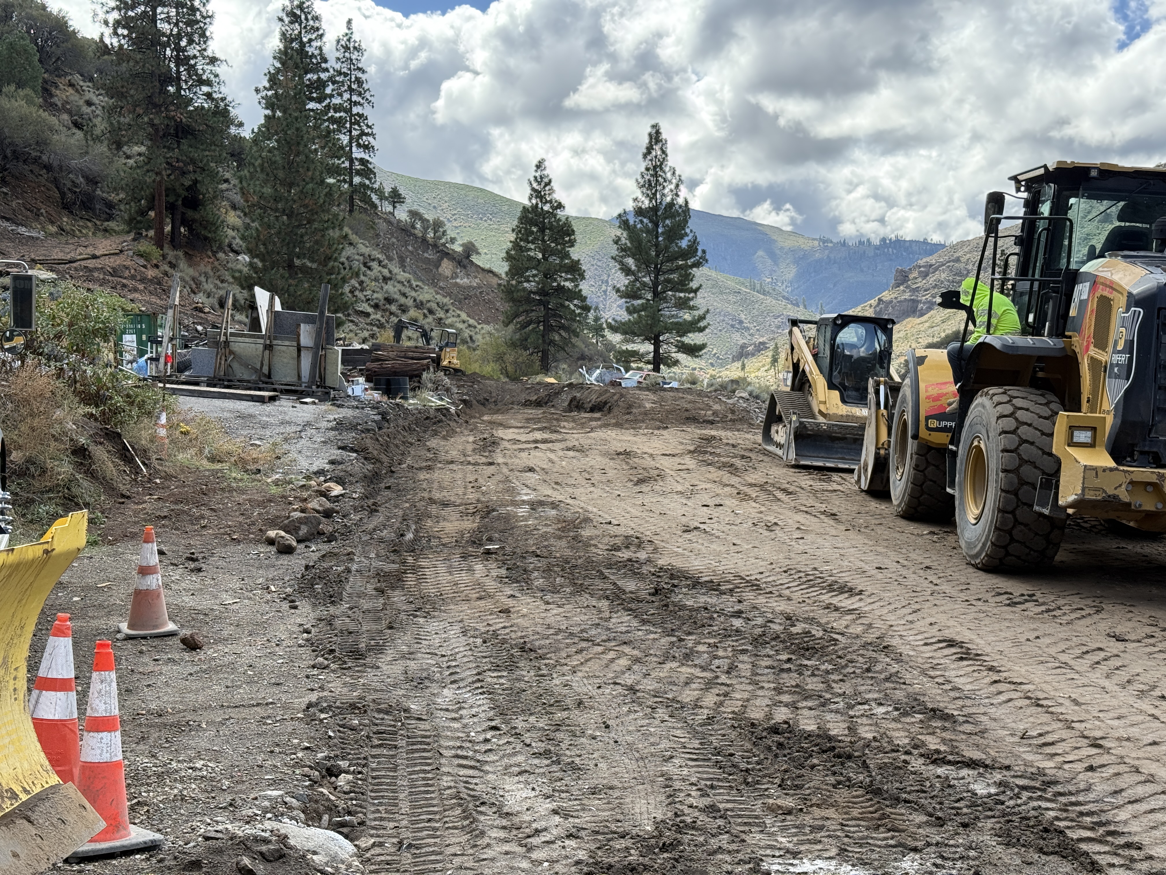 The image shows a construction site with a dirt path running through it, suggesting ongoing site work or preparation. A large front loader and a compact track loader are parked on the right side of the path. There are construction materials and barricades visible to the left. The site is surrounded by trees and hills, creating a rural backdrop.