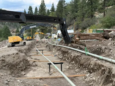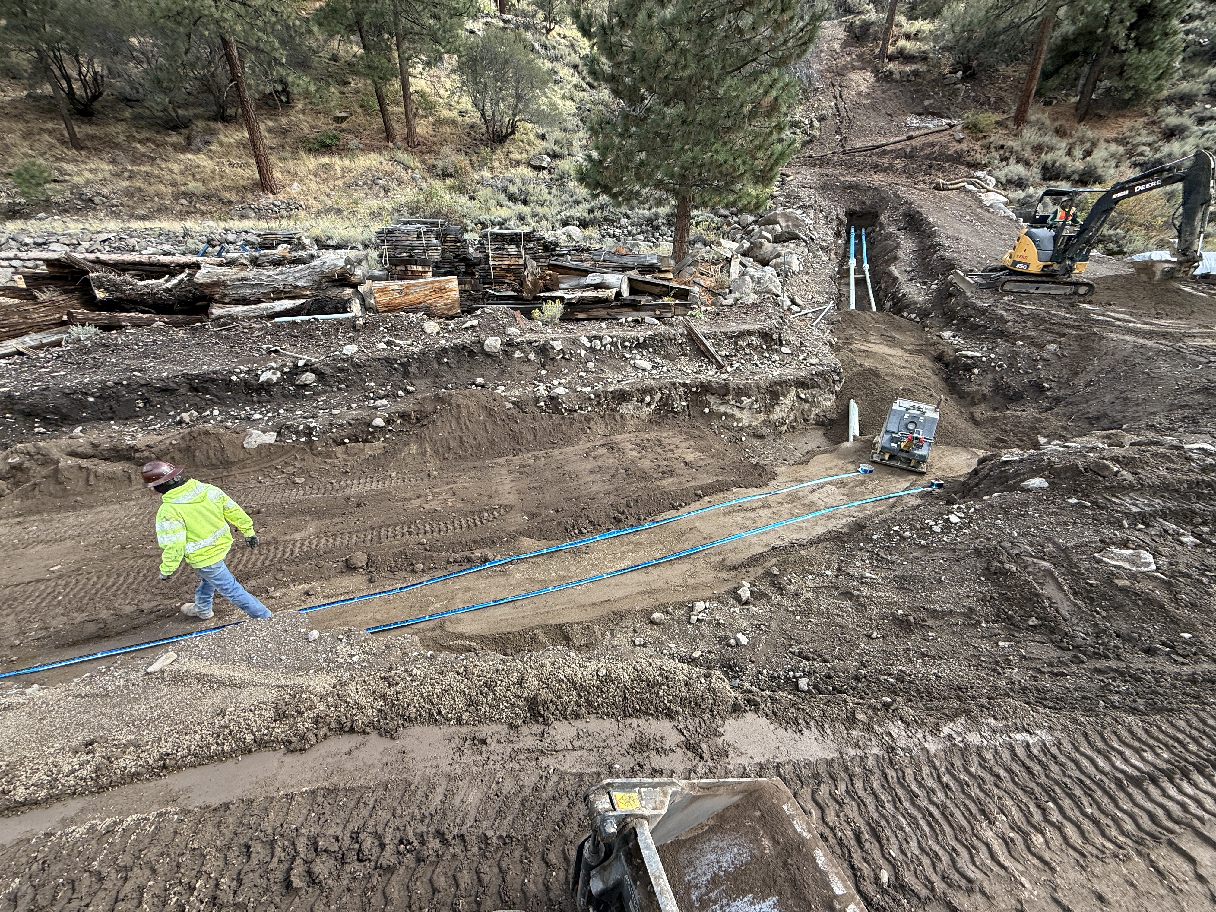 An open trench is visible with pipes laid at the bottom. A worker in a hi-vis vest and hard hat is present, and there is an excavator working at the site. Soil and dirt are evident around the trench, which runs through a wooded area. Pipe installation appears to be underway.