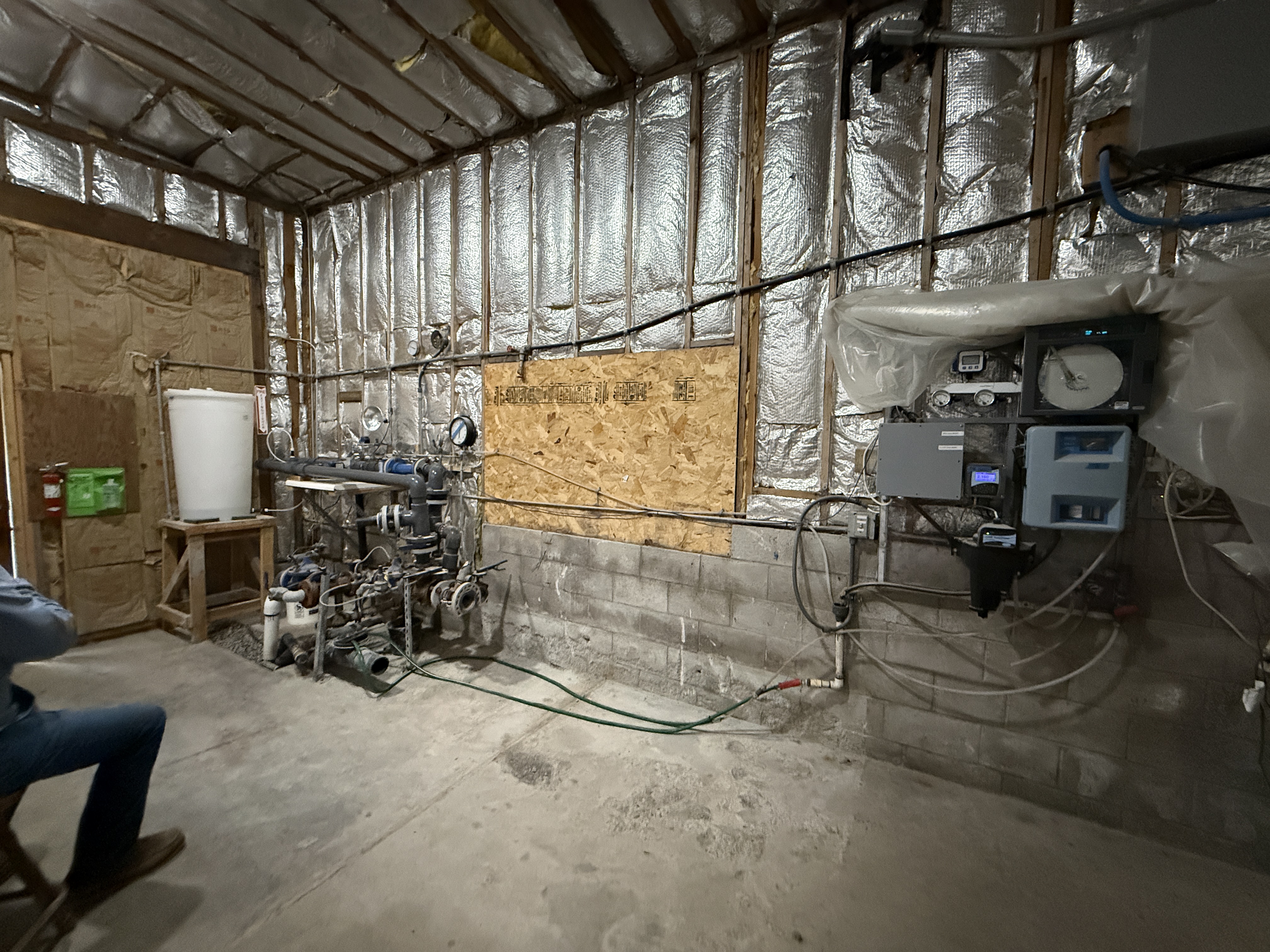 The image displays an indoor area of a water treatment plant with visible filtration components and control equipment. Pipes and gauges are positioned on the left side of the frame, while monitoring equipment is mounted on the wall to the right. The room is insulated with reflective and fibrous materials, suggesting it is prepared for water treatment operations. Insulation boards cover part of the wall, and there are no visible workers actively engaged in tasks.