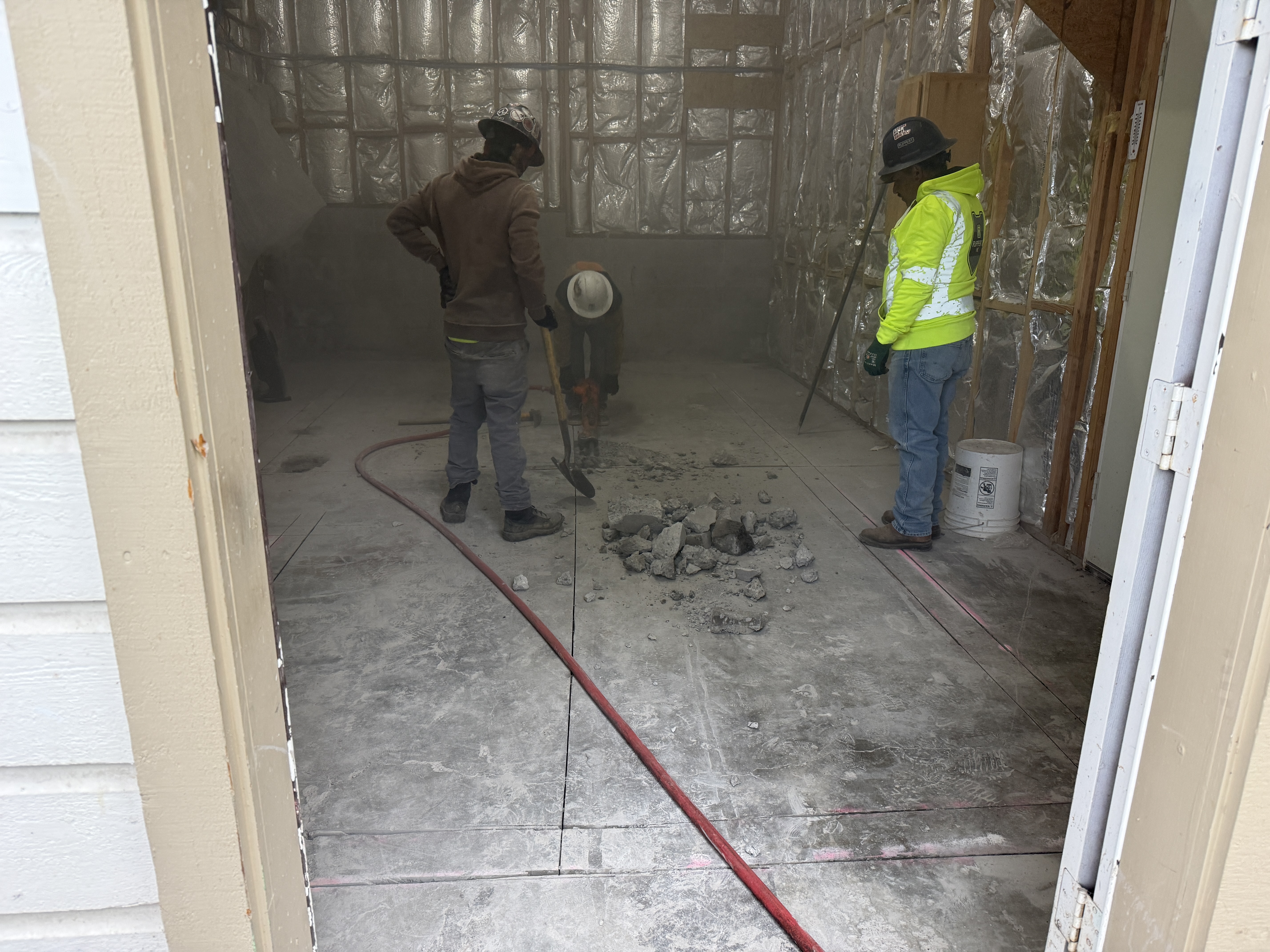 Three workers are inside a water treatment plant room, with one operating a jackhammer to break the concrete floor. Pile of broken concrete is visible on the floor. Walls are insulated, and pink chalk lines are marked on the floor. Two workers are wearing hi-vis clothing and hard hats, observing/assisting the operation.