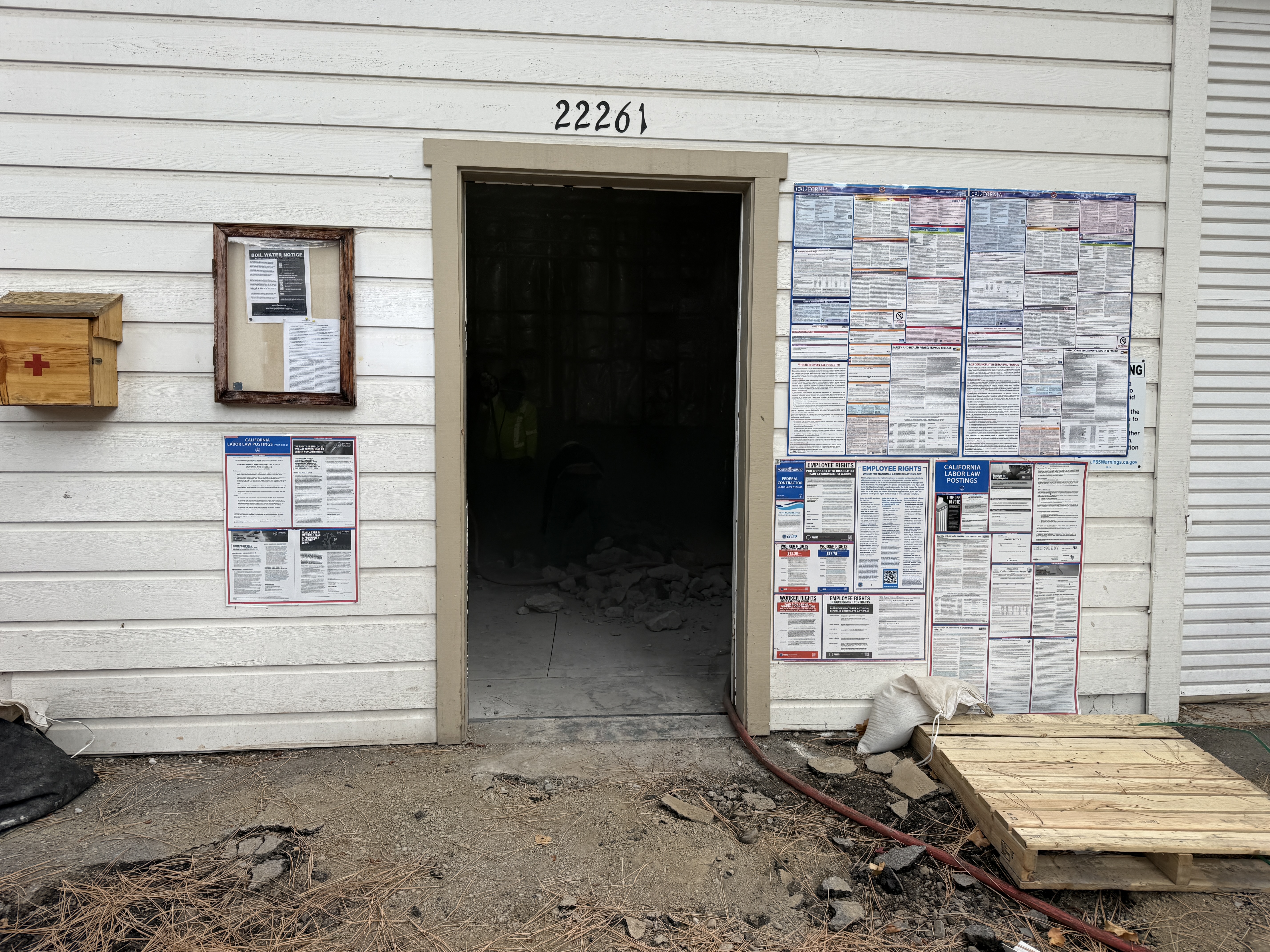 The image shows an entrance area of a building with multiple labor laws and safety information postings on the wall beside the doorway. There is a first aid box mounted on the exterior wall, and the inside of the room appears to be under construction with visible rubble. The surrounding ground surface consists of dirt and rocks, with some improvements made for access.
