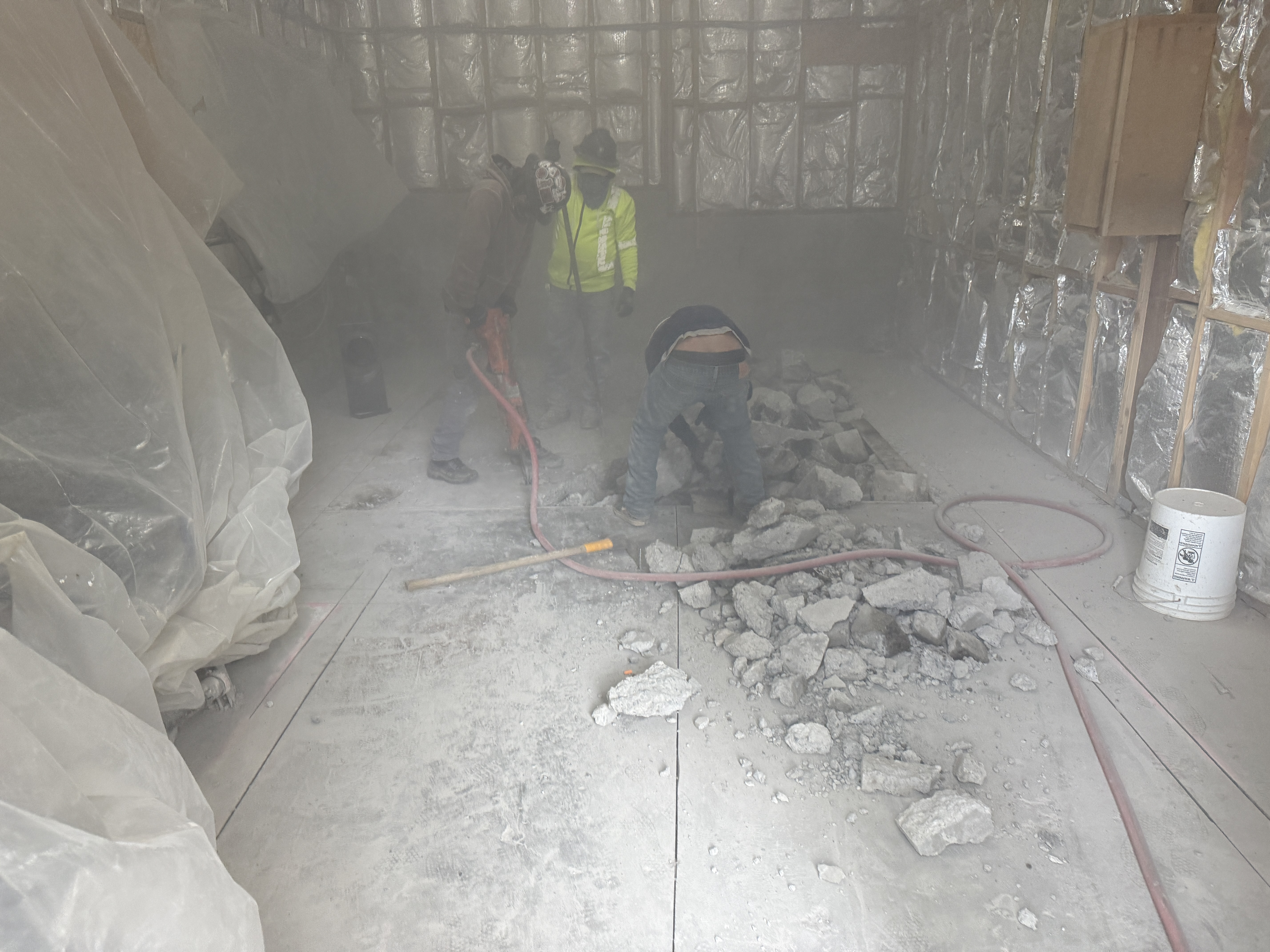 The image shows three workers inside an indoor water treatment plant area engaged in breaking apart a concrete floor. The ground is covered with broken concrete pieces. One worker uses a jackhammer, while others are assisting. The room is insulated, with plastic sheeting and exposed framing visible on the walls.