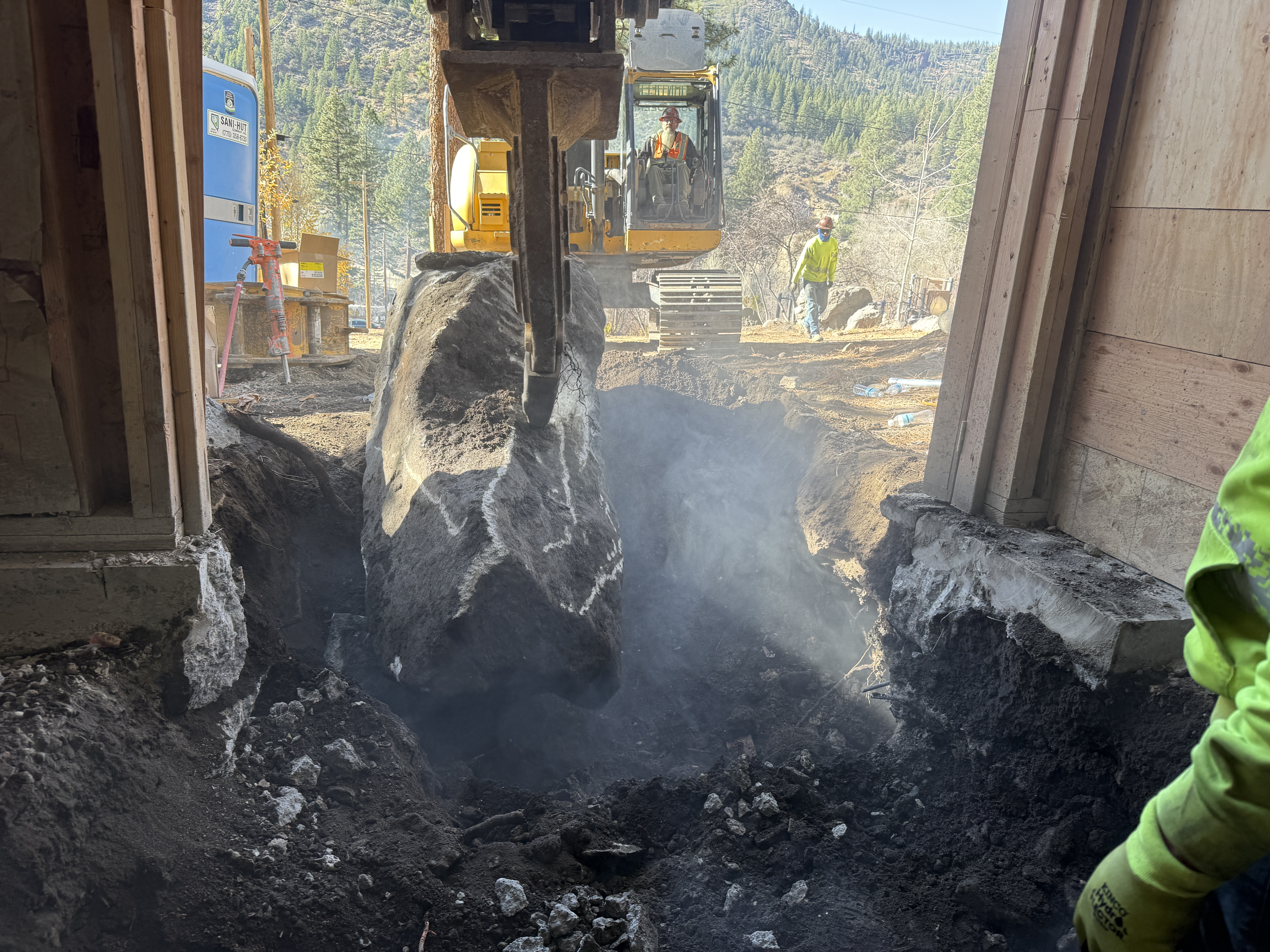 The image shows an excavator removing a large rock from a trench indoors at a water treatment plant. The operator is visible inside the excavator, and another worker is standing nearby. There is a portable restroom and some construction equipment outside the trench area. The lighting suggests daytime work and some soil dust is visible around the excavation site.