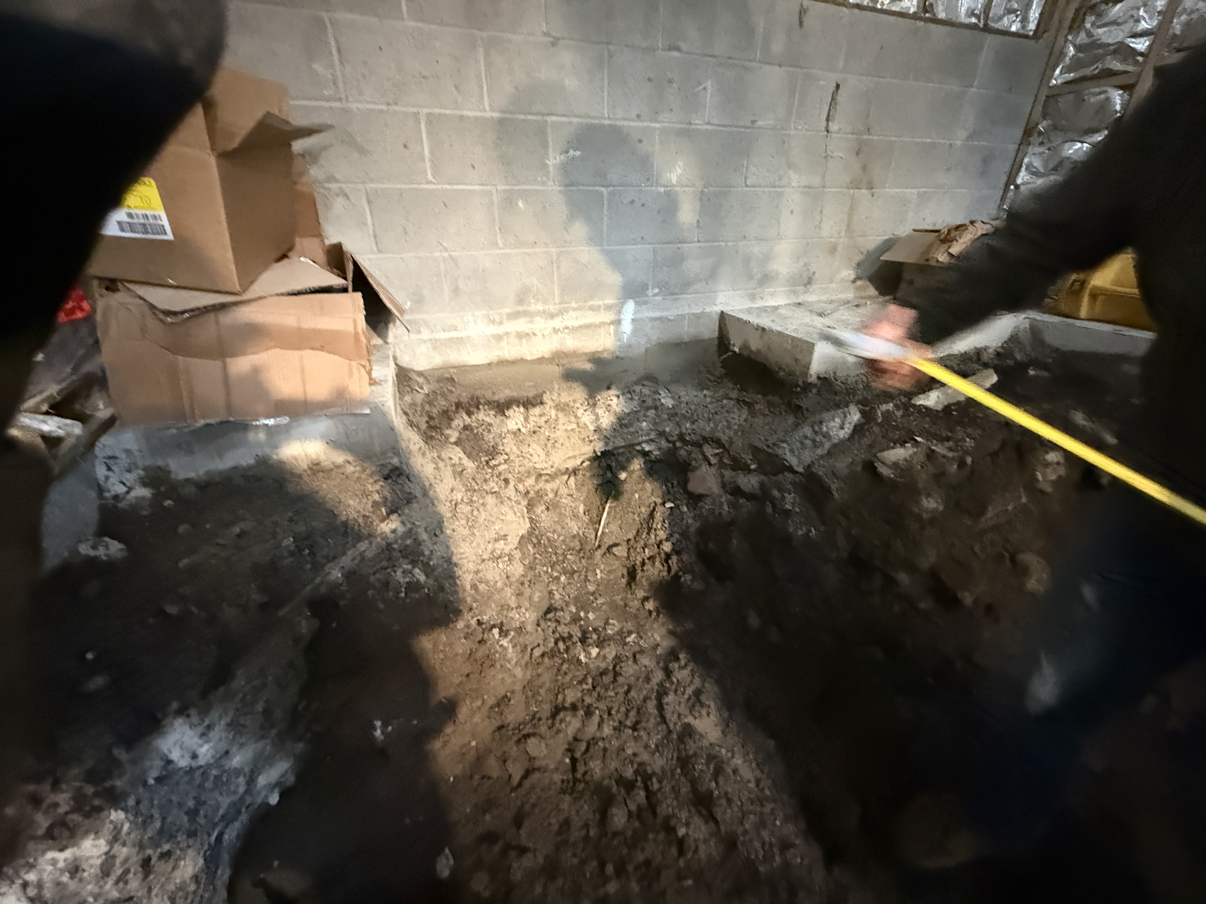 The image shows an area with visible exposed soil and uneven ground, indicating ongoing excavation work. A concrete wall is positioned in the background with a box placed beside it. A person is visible with a measuring tape, suggesting site measurements. The environment seems to be indoors with artificial lighting.