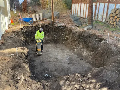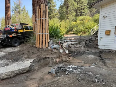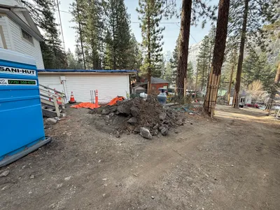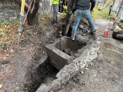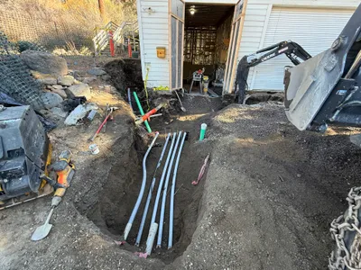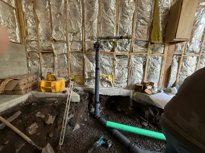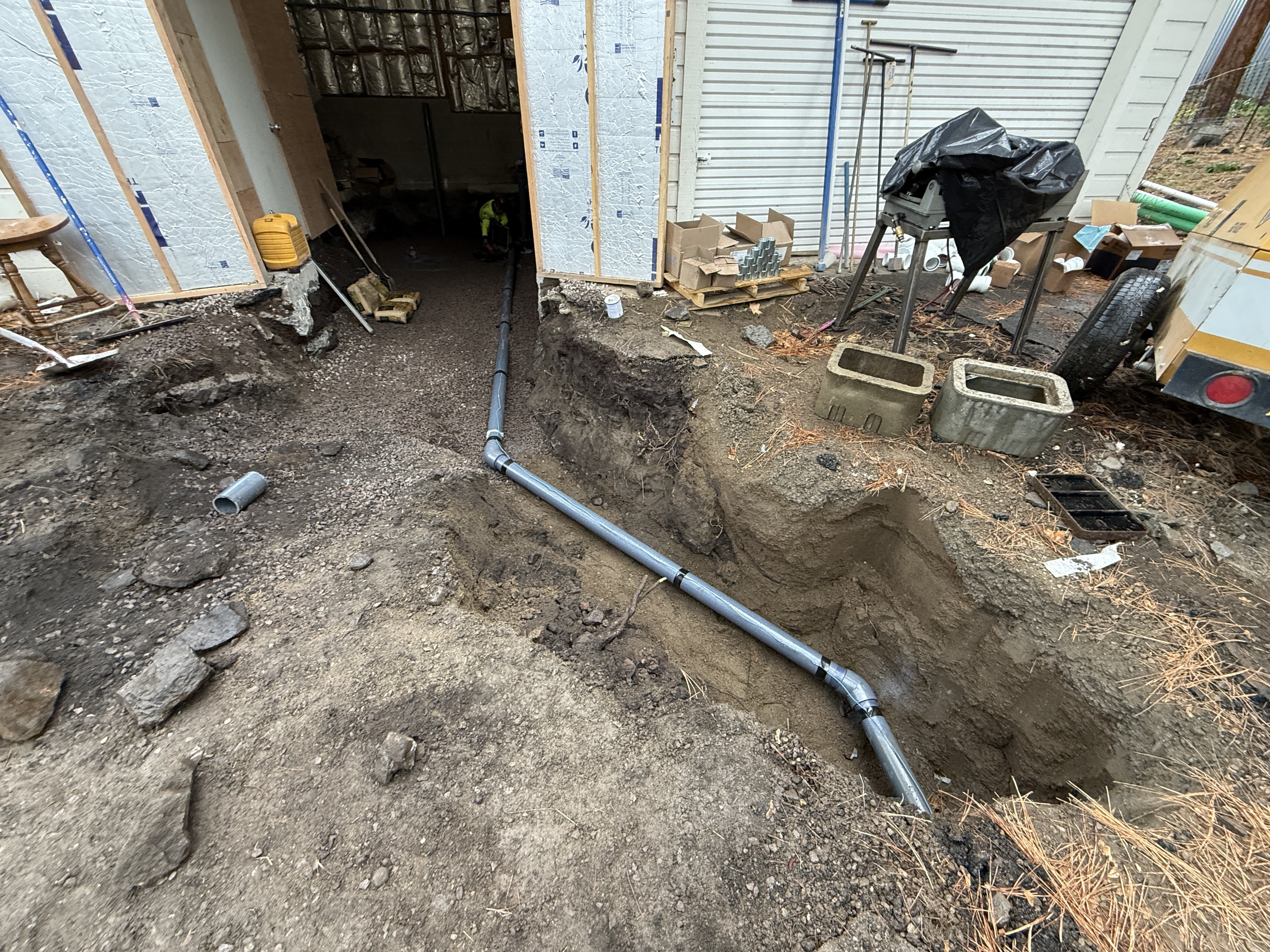The image shows a trench leading into a building with a pipe installed at the bottom. The trench is surrounded by soil and gravel, with some concrete blocks placed nearby. There is a partially constructed or renovated area visible inside the building in the background. The pipe appears to be newly installed, possibly part of a water or drainage system.