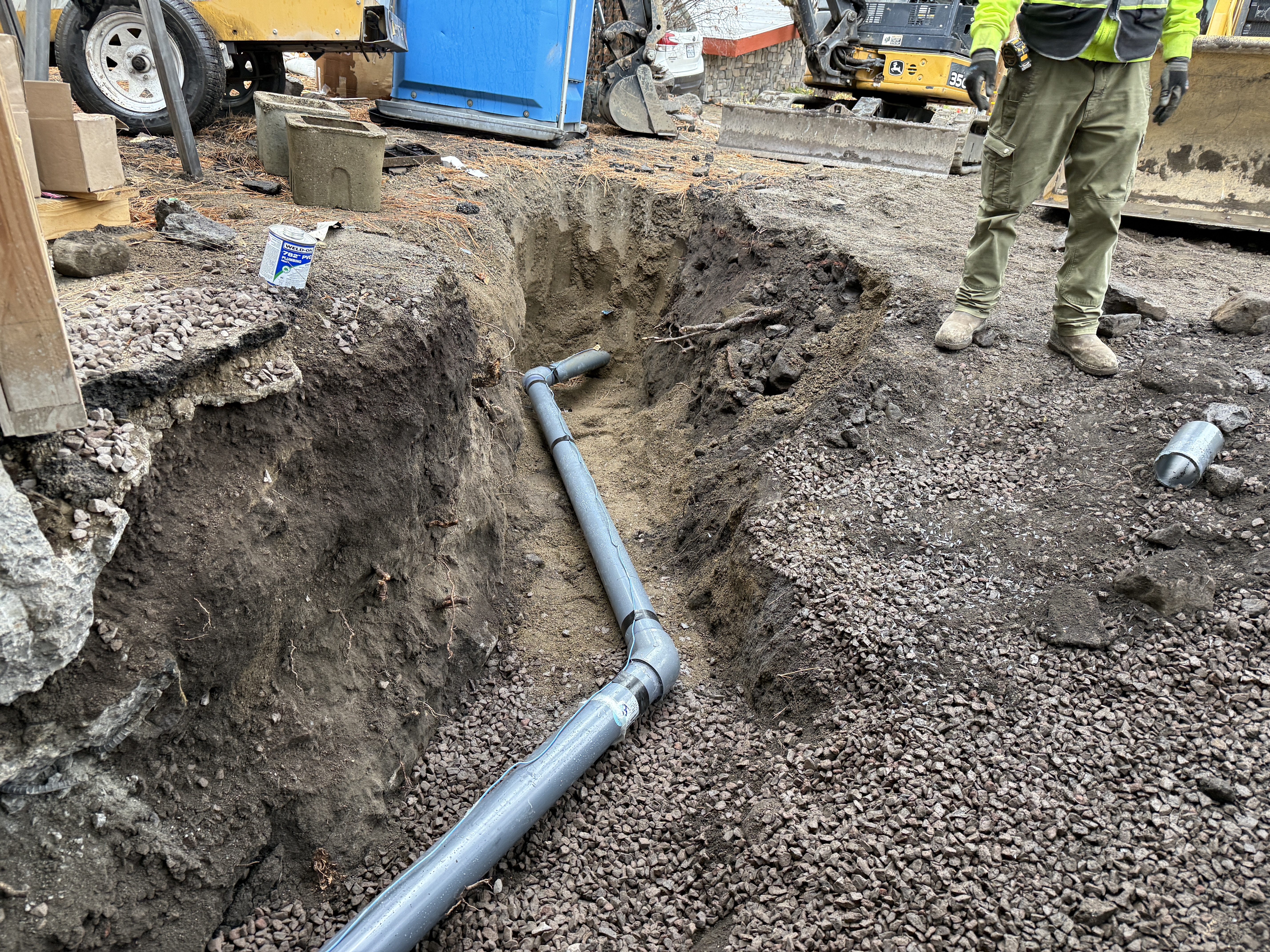 The image shows an open trench with grey PVC pipes partially installed. A worker wearing PPE stands next to the trench. Excavators and construction equipment are seen in the background. The area is covered with small gravel and dirt debris. Construction materials like a bucket and a box can also be observed around the site.