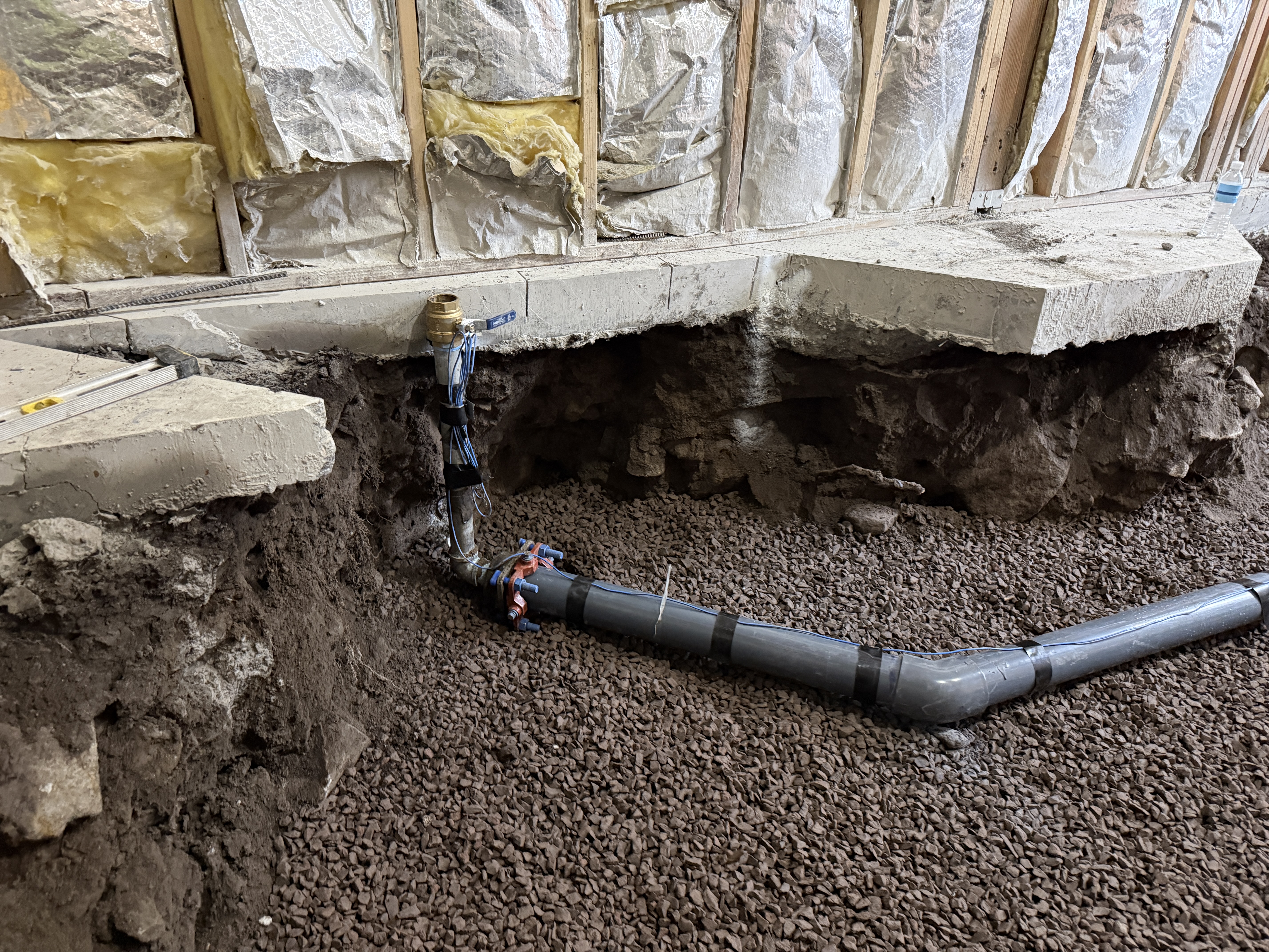 The image shows a section of the water treatment plant where trenching and pipeline installation are underway. A pipe with several bends and connections is visible, partially buried in a trench filled with small gravel. The walls show exposed insulation and construction debris around the trench area. The setting suggests ongoing construction activities inside the building.