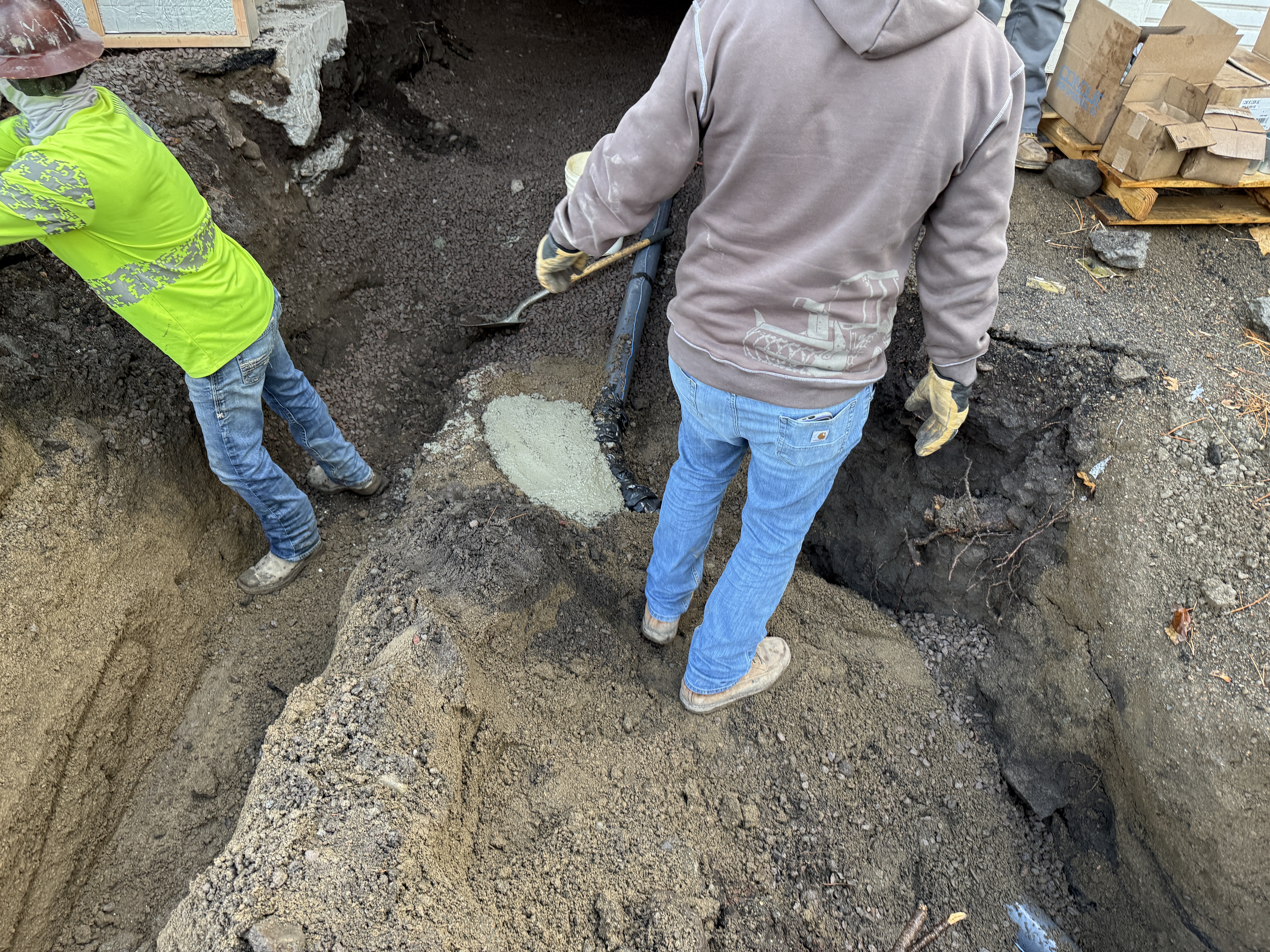 The image shows two workers standing near an open trench area within a water treatment plant. One worker is using a shovel, possibly to level soil or pour concrete, while the other is positioned at the trench edge. A small concrete patch is visible on the trench floor. Loose soil is piled around the trench, with some cartons or boxes and a palette in the background.
