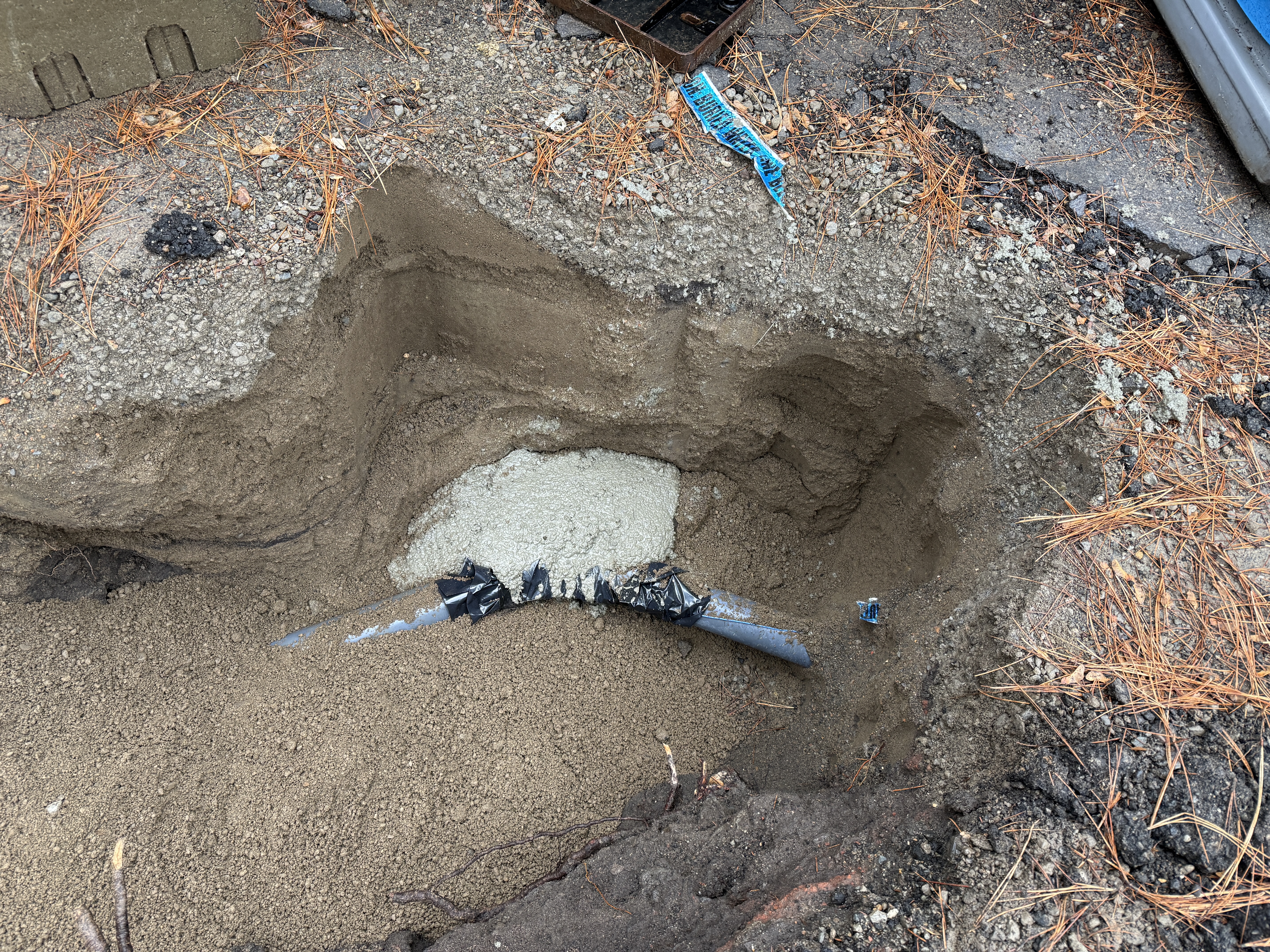 The image shows an open trench with part of a pipe exposed, possibly during an excavation process. The trench contains soil and what appears to be gravel or backfill material next to the exposed pipe. The surrounding area has scattered pine needles, indicating an outdoor setting. There is no visible heavy equipment or safety measures in place such as barriers or caution tape.