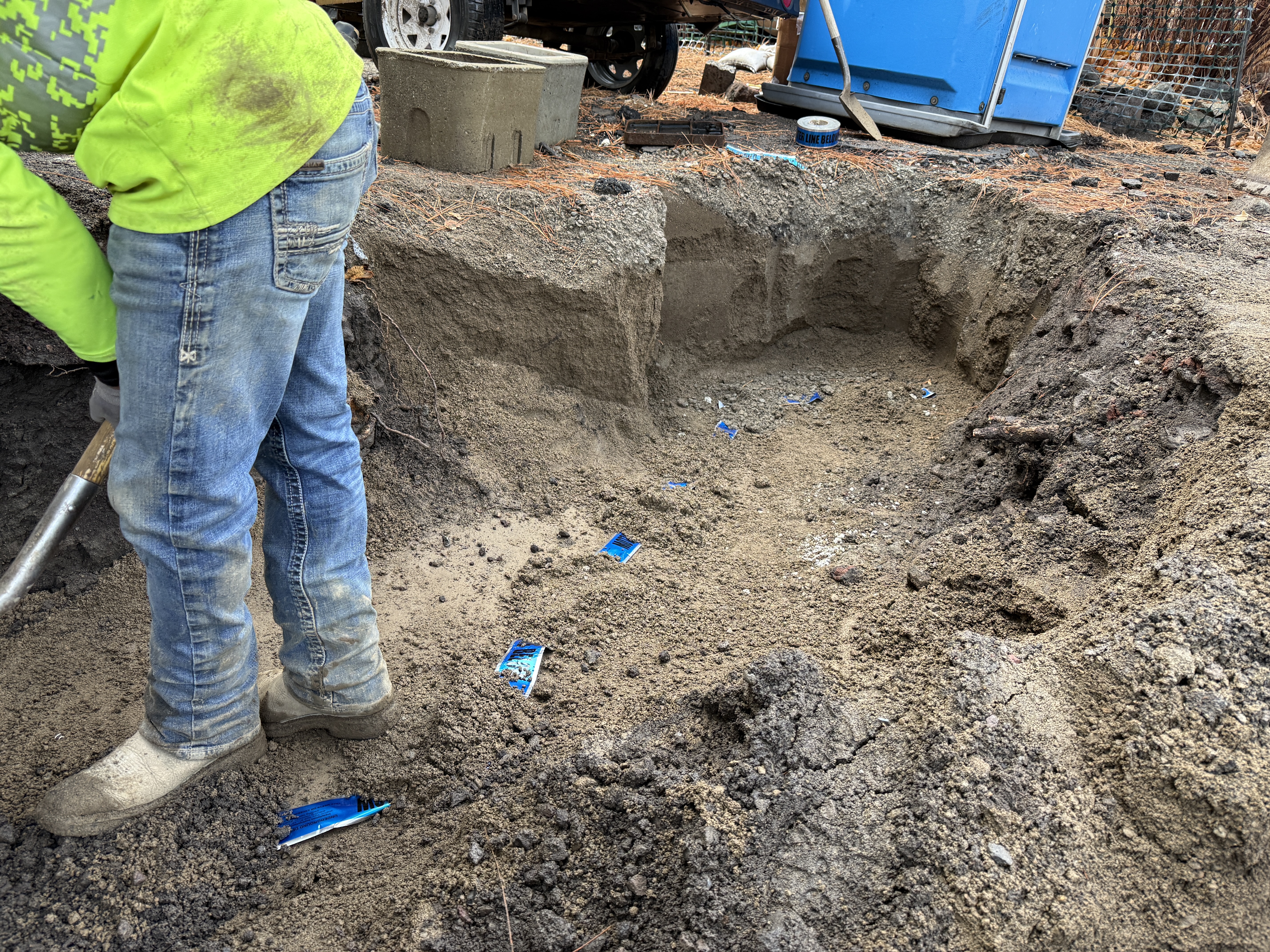 The image shows a worker in blue jeans and a neon safety shirt digging with a shovel in a large trench. The trench is filled with loose soil, and there are pieces of blue plastic debris scattered throughout. A portable toilet and a large vehicle wheel are visible in the background. The activity seems to be part of an excavation or trenching process.