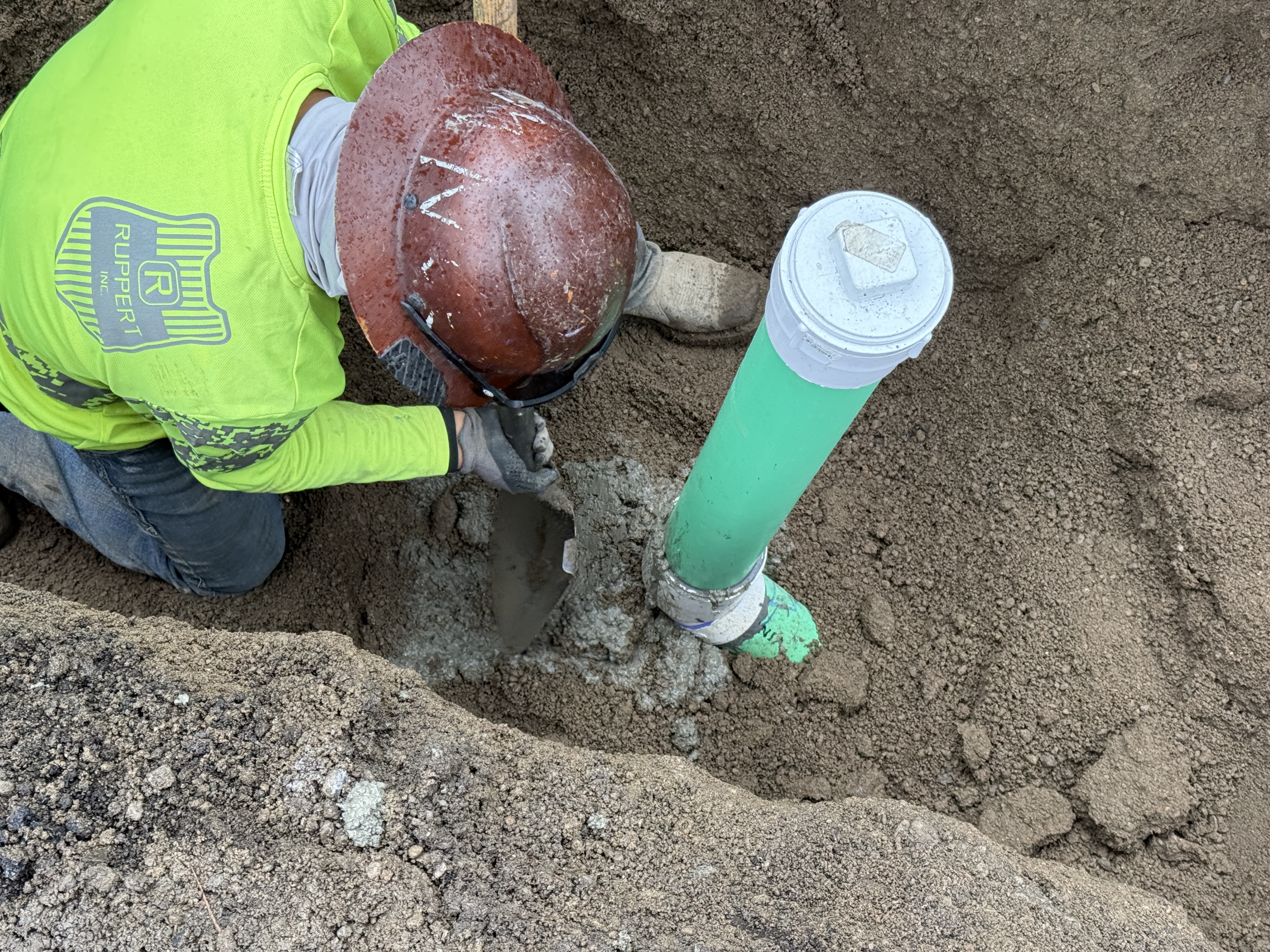 A worker wearing a hard hat and high-visibility clothing is observed inside a trench handling or installing a green pipe. The person is using a hand tool to work with the soil surrounding the pipe. The trench and pipe appear to be part of a water treatment project, but the specific purpose of the pipe is not clear.