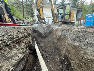 PPE such as hard hats, hi-vis vests, and work boots are visible on the workers.