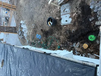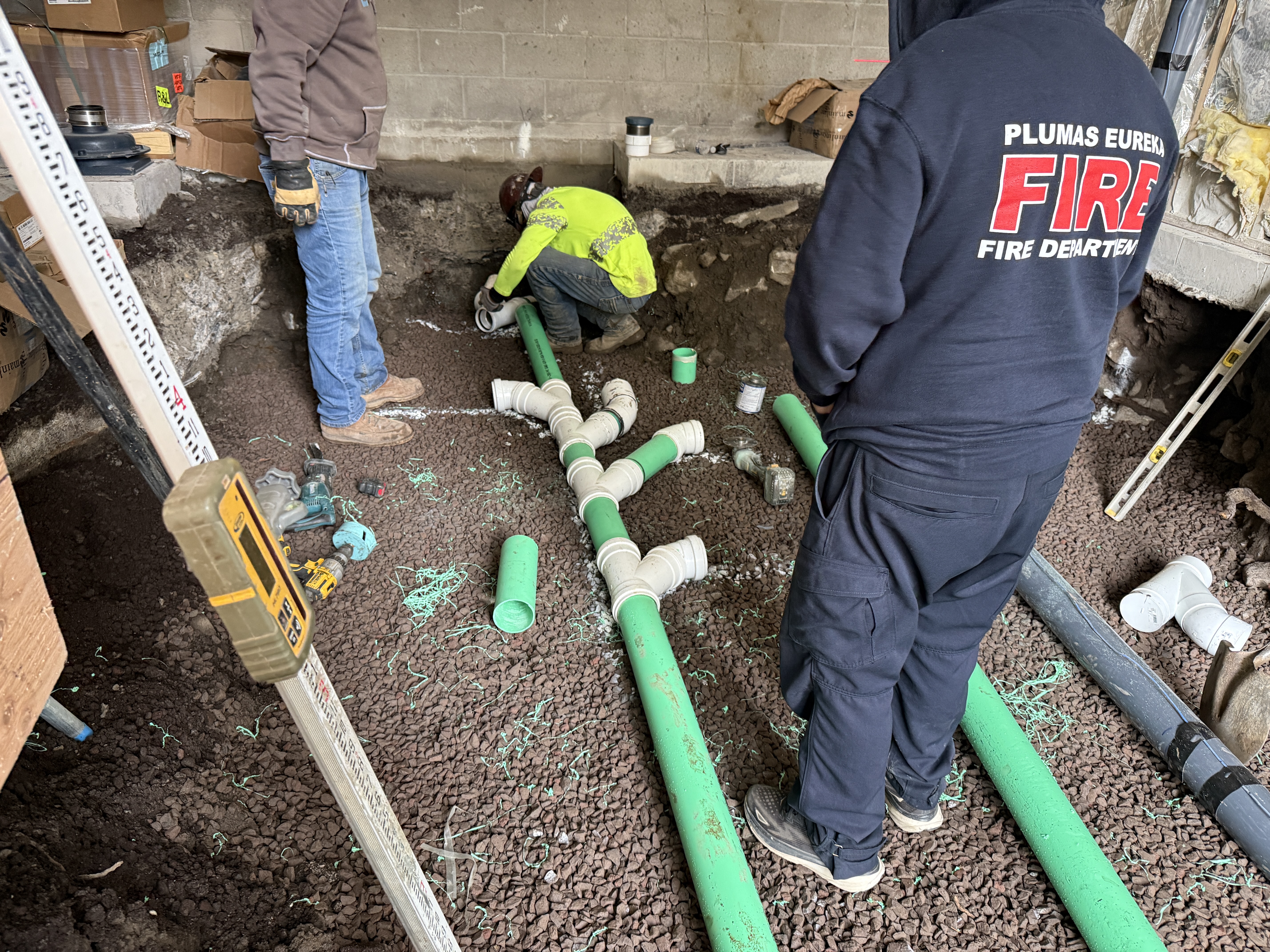 The image shows workers in a partially excavated indoor area installing green pipes using PVC fittings. One worker is crouched on the ground connecting pipes, while others stand nearby. A layer of small reddish gravel covers the ground. Various hand tools and a level are scattered around the work area.