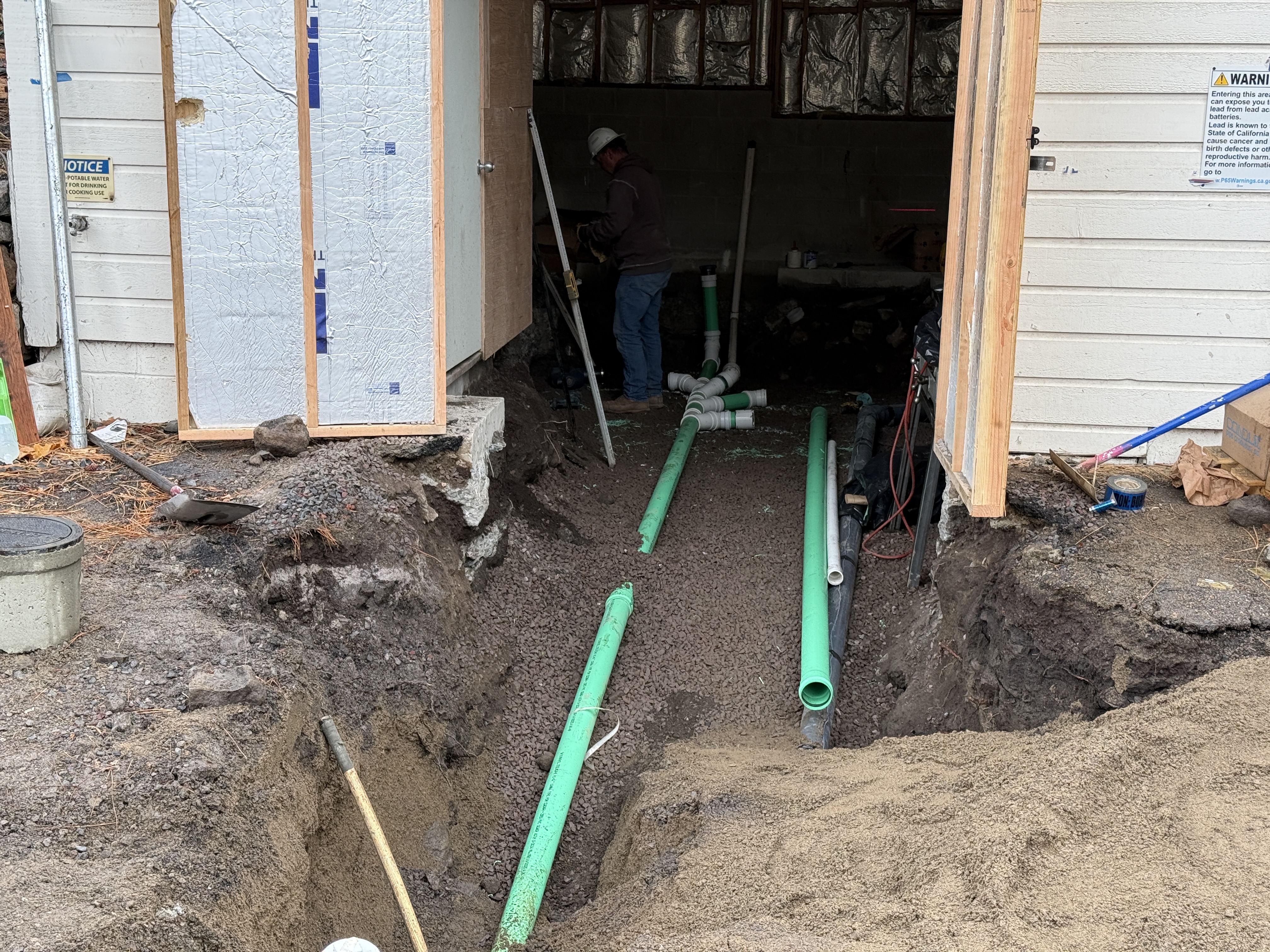 Inside a water treatment plant, an open trench runs from outside into a part of the building, where green pipes are being installed. A worker in a hard hat is visible in the indoor area. The trench appears to be happening indoors and connects to larger pipeline system components. Soil and construction materials are scattered around.