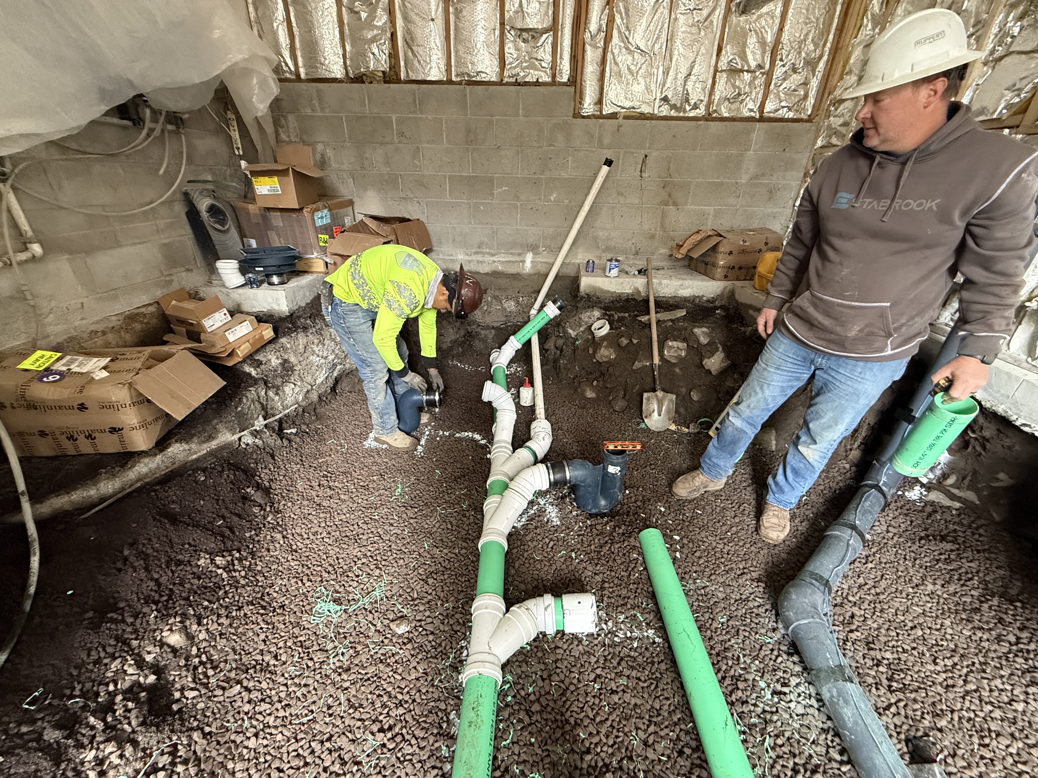 The image shows two workers in a room working on installing pipelines. Several PVC pipes with fittings are installed across the floor, and the ground is covered with gravel. One worker is actively handling a component, while the other observes. The walls show insulation and utility placements.