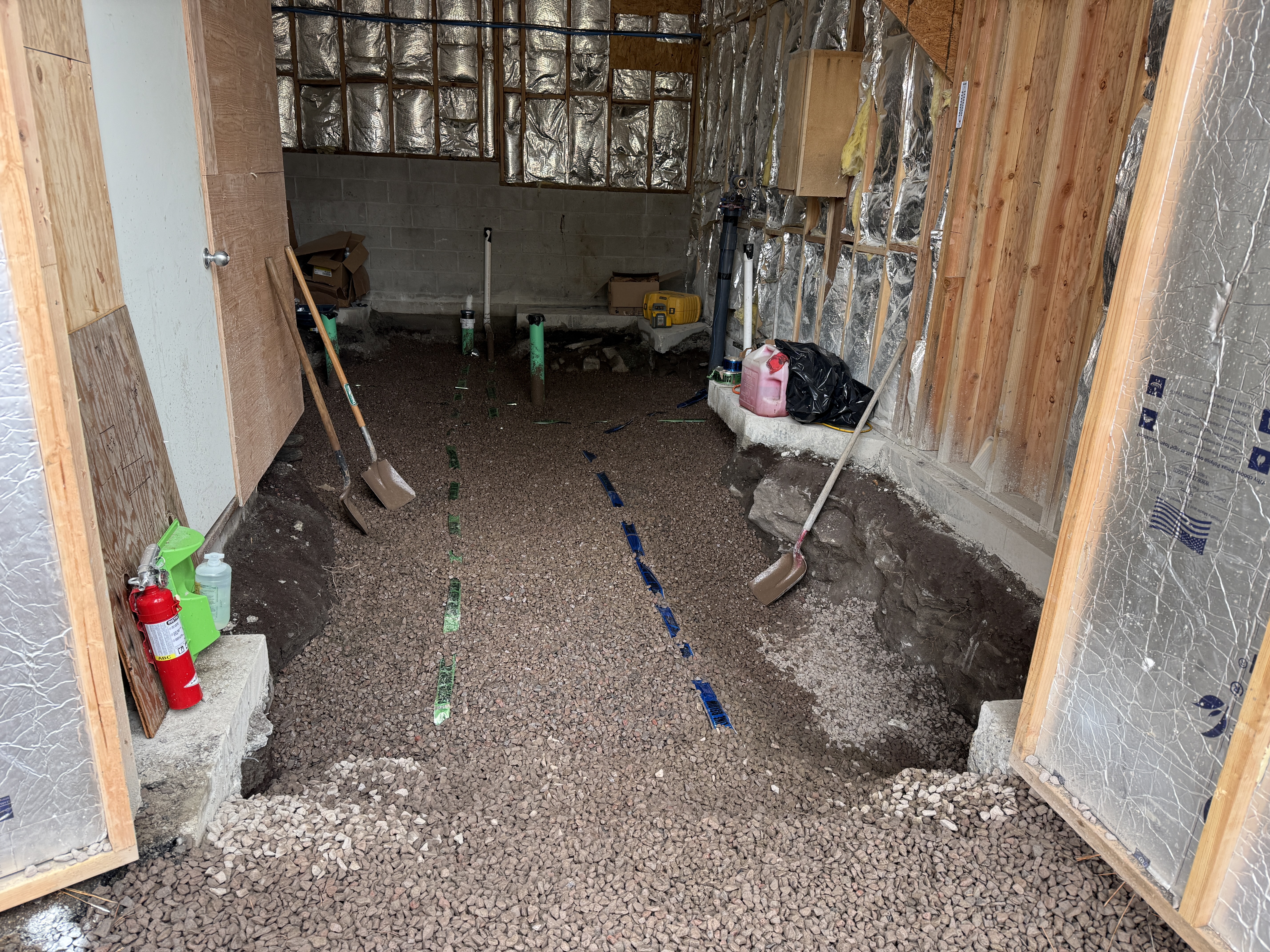 The image shows an indoor area of a water treatment plant with gravel spread on the ground. Several vertical pipes are protruding from the ground in a line, likely indicating plumbing or conduit alignment. The walls are insulated with reflective material and there are tools like shovels leaning against the wall. A fire extinguisher and other construction materials are also present in the space.