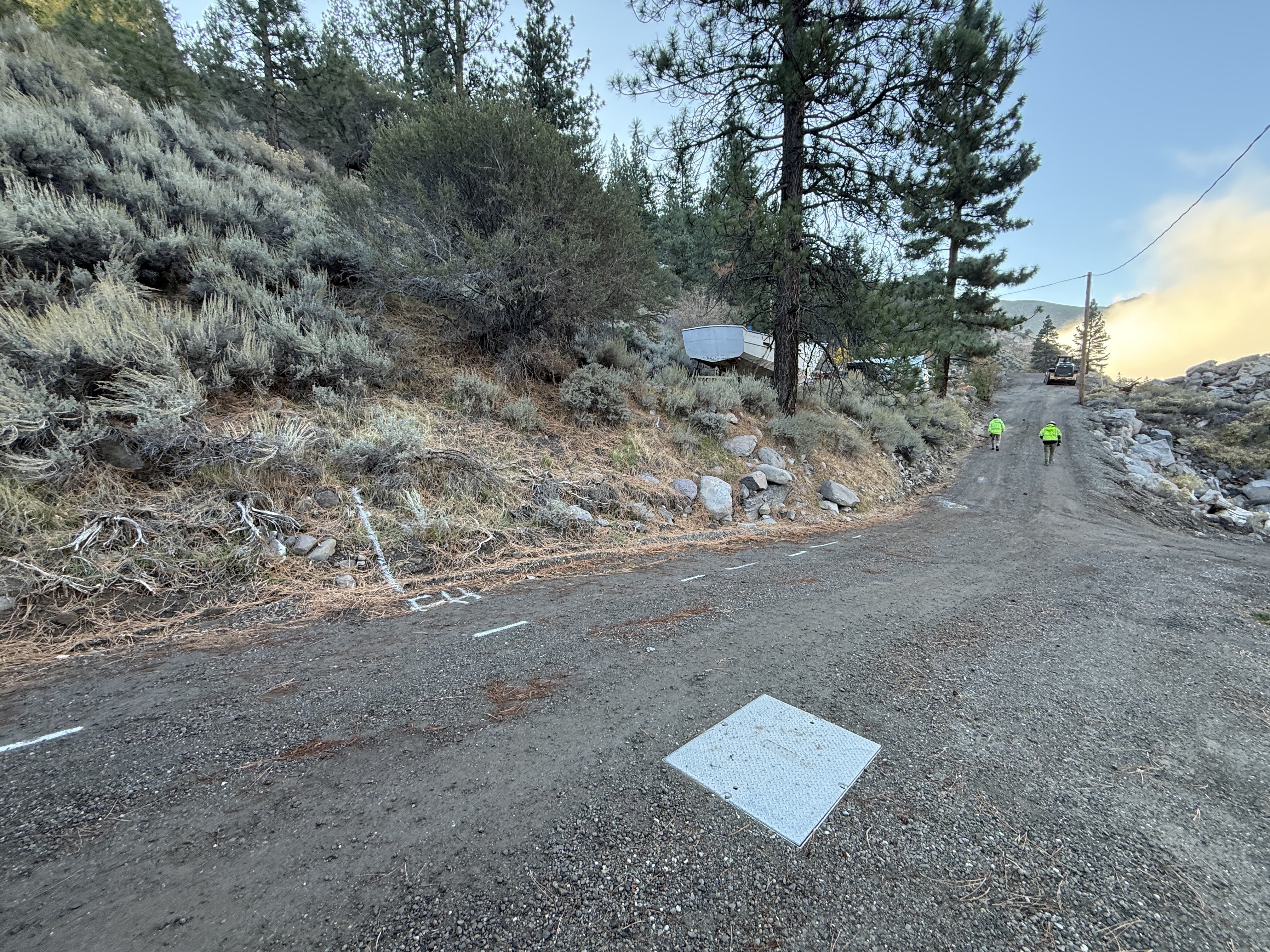 The image shows a gravel road with visible markings alongside a grassy and rocky hillside. There are two individuals wearing hi-vis clothing walking up the road. In the background, there is a vehicle or piece of equipment at the top of the road. Some trees and bushes are present alongside the road.