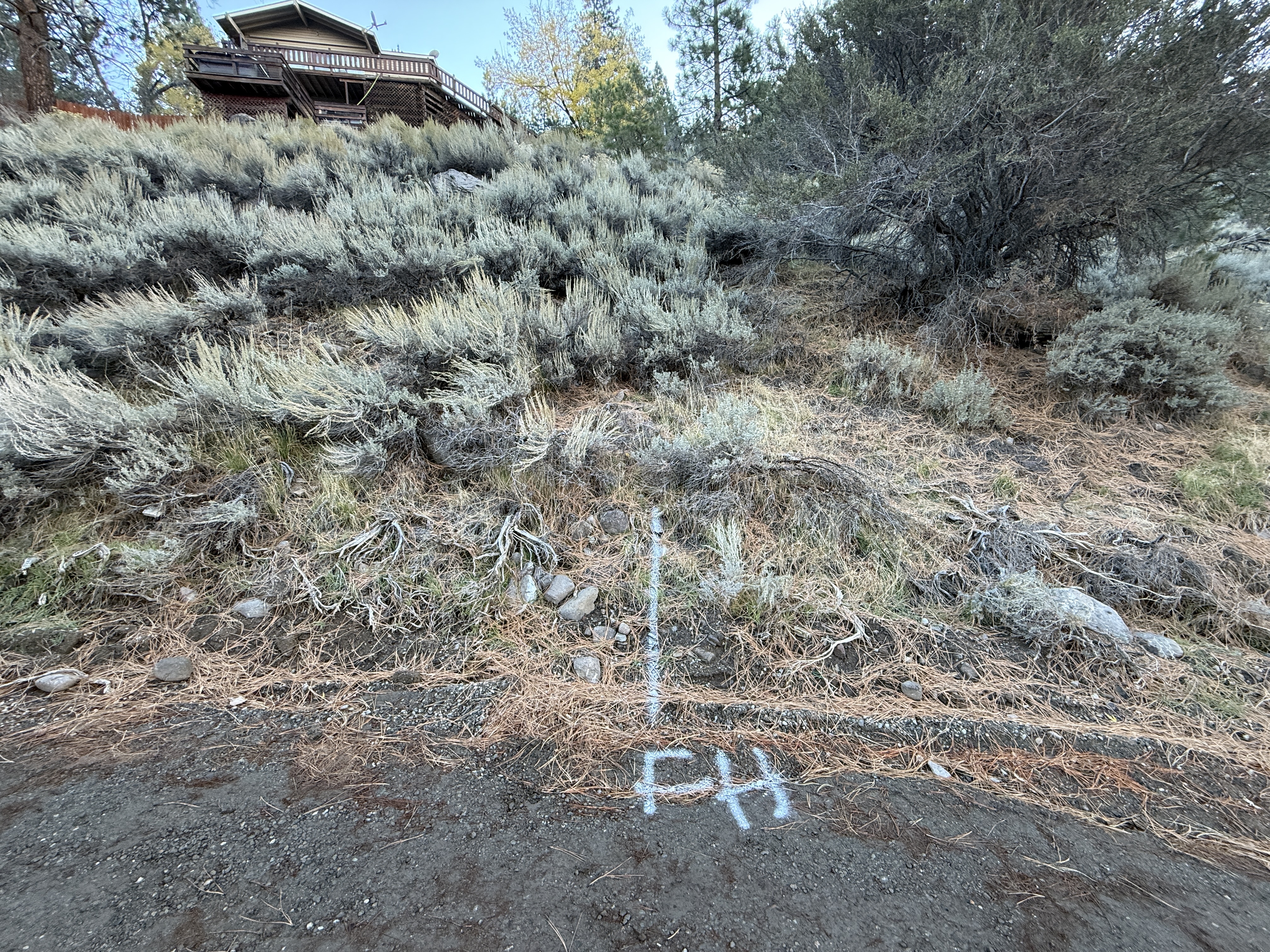 The image shows a marked fire hydrant location indicated by white paint on a slope covered with plants. The marking 'FH' is clearly seen on the ground with a vertical and horizontal line, suggesting a planned installation area. In the background, a residential building and trees are visible, but no active work is occurring.