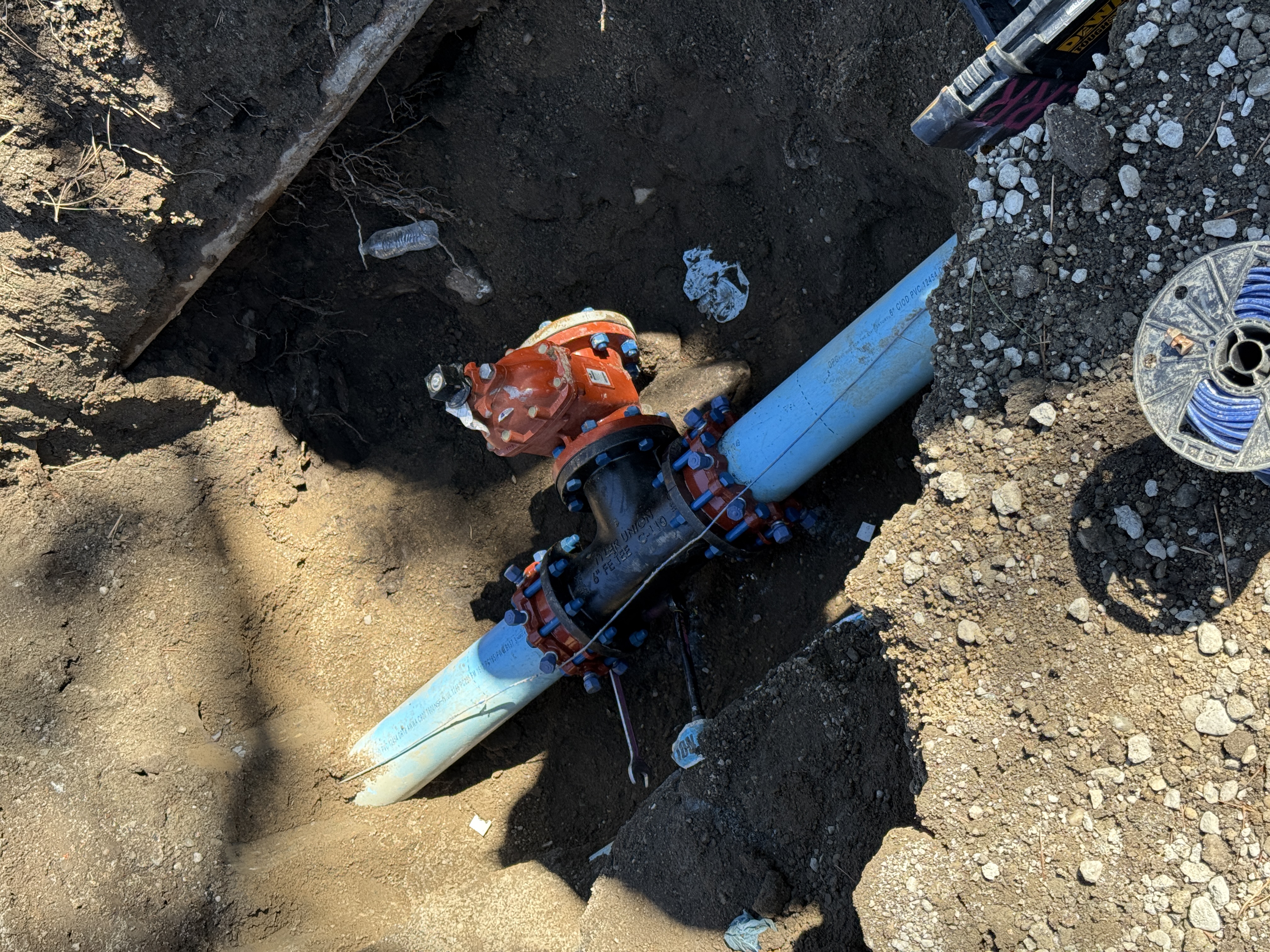 The image shows an excavated area with a fire hydrant valve assembly being installed on a blue pipeline. The red valve assembly is secured with bolts. The area is surrounded by soil, with some loose gravel on the surface. A coil of wiring is on the ground near the excavation.