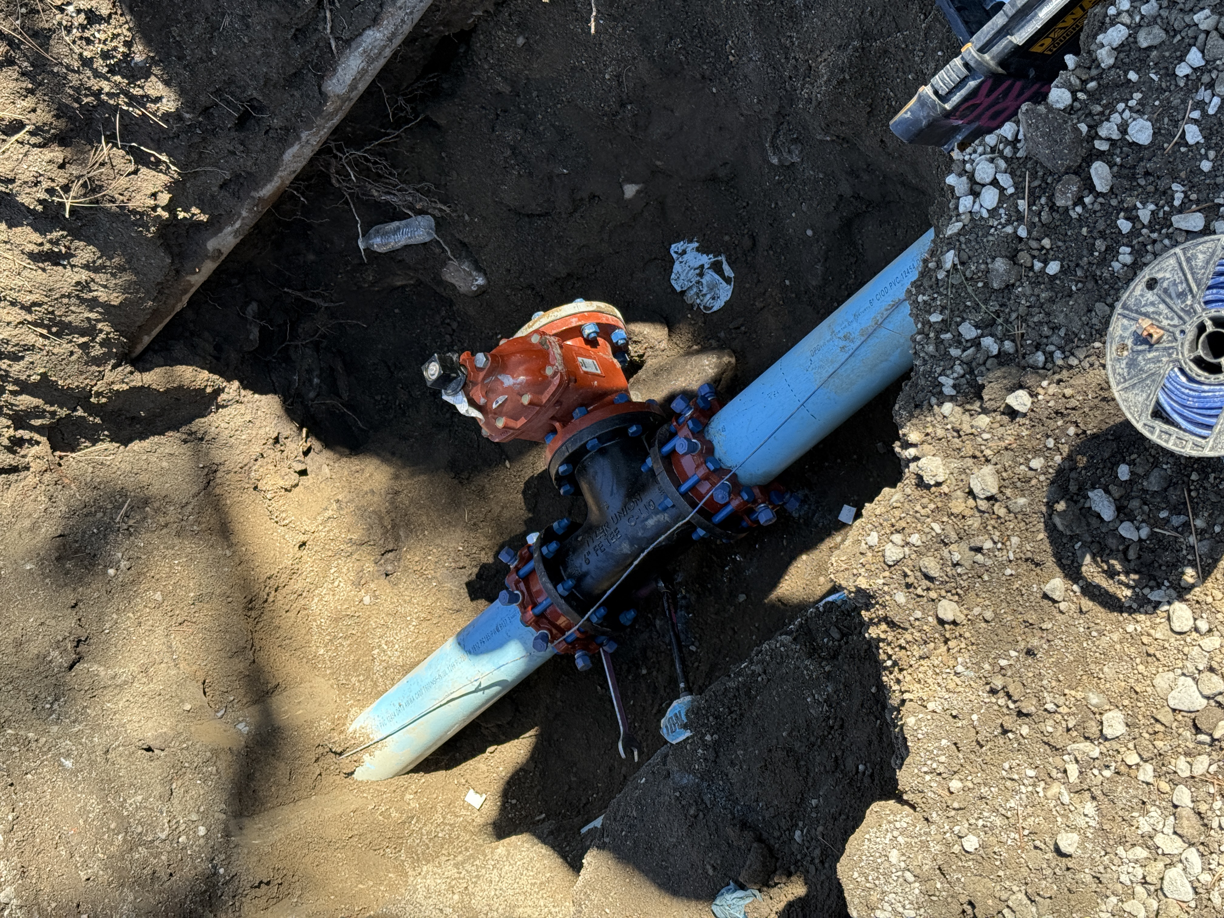The image shows a partially buried pipeline with an attached valve inside a trench. The pipe is blue and aligned horizontally with a red valve assembly connecting a black section. Dirt and soil are visible around the pipeline indicating recent excavation. Residual construction materials are scattered nearby, such as a plastic bottle.