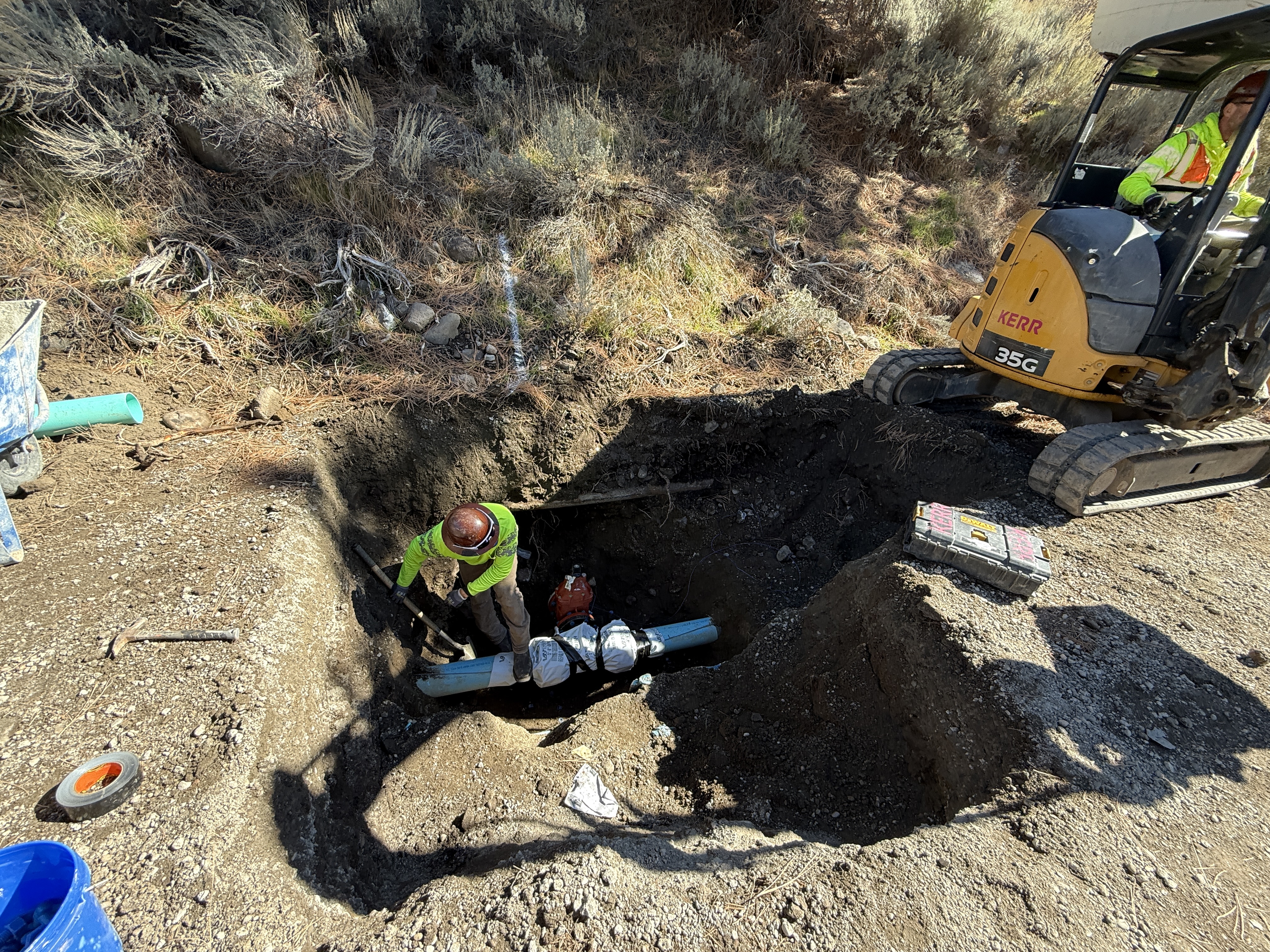 The image shows a worker in a trench installing a blue pipeline. A mini excavator is positioned at the edge of the trench, assisting with excavation. Workers are wearing typical safety gear including hard hats and hi-vis vests. The trench is located in a gravel and dirt area with some shrubbery in the background. The setting appears to be outdoors with natural daylight.