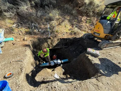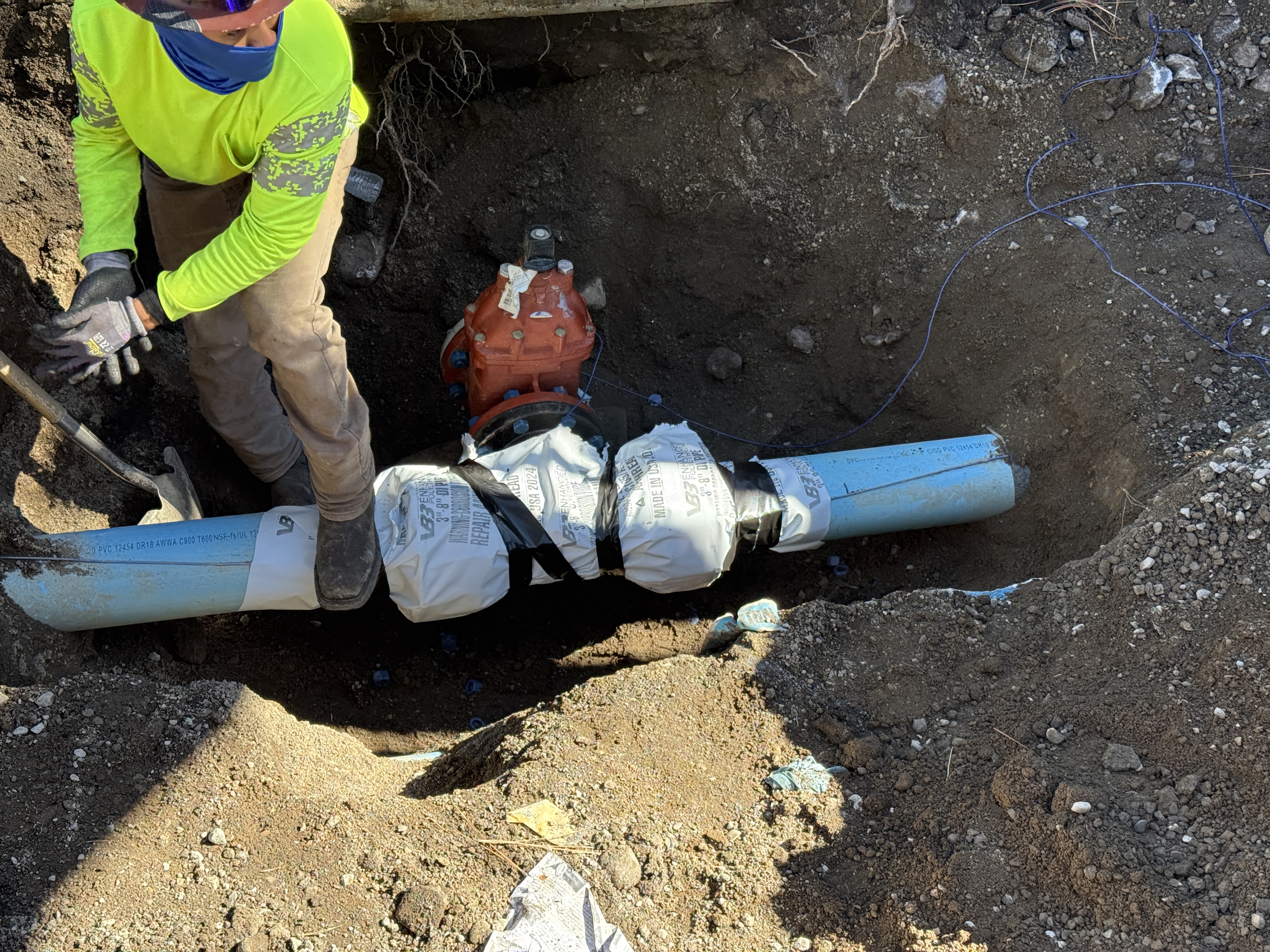 The image shows a worker in a trench installing or adjusting a section of pipeline. The worker is wearing appropriate PPE including a hard hat and high-vis clothing. The blue pipes are joined by a central valve assembly secured with wrapping. The trench is open with loose soil around.