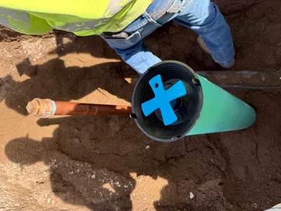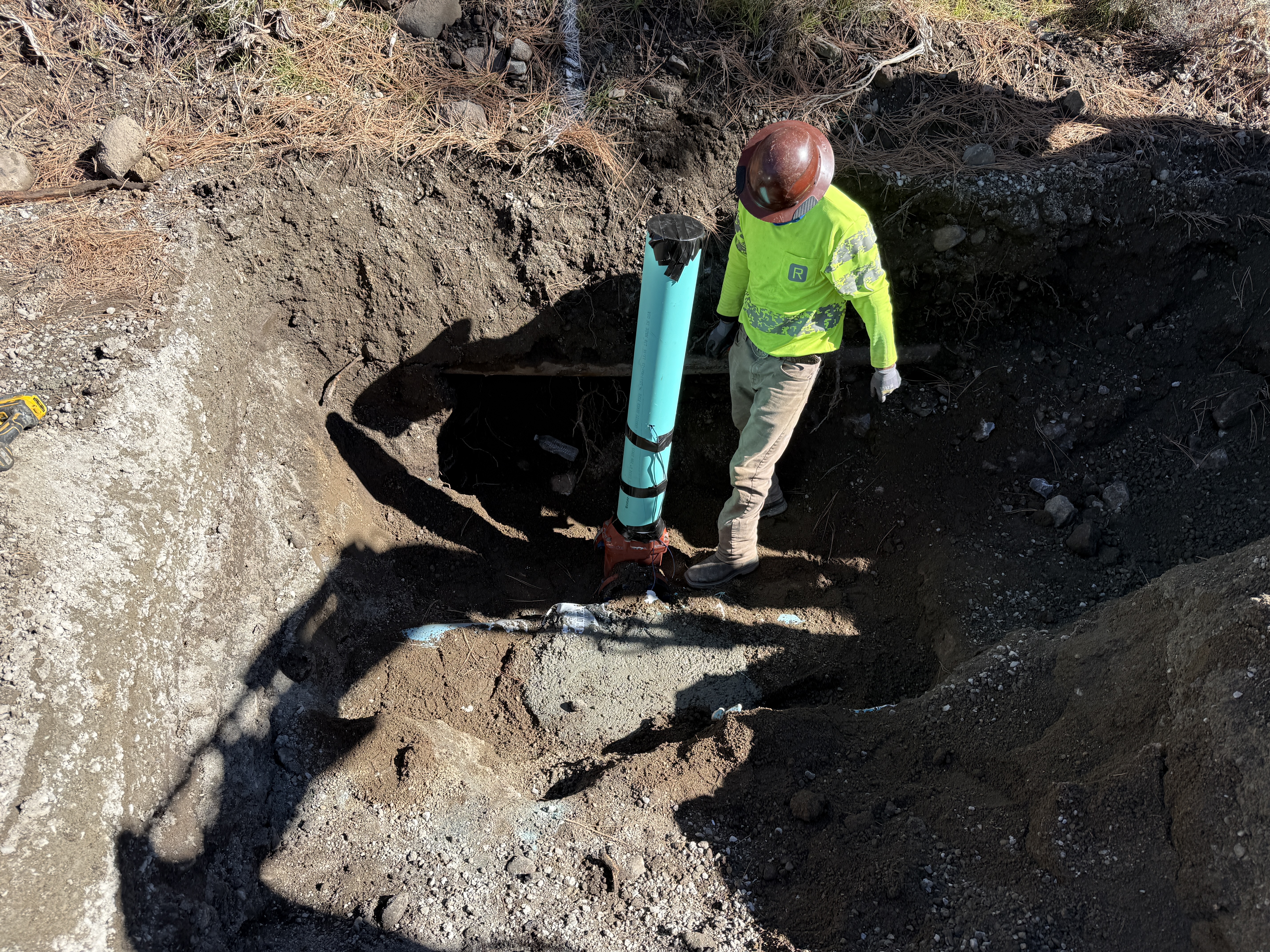 A worker in a hi-vis vest and hard hat is seen in a trench, holding a blue pipe. The trench walls are earthen and uneven, indicating recent excavation. The worker appears to be positioning the pipe vertically. Surrounding soil and shadows suggest the work is taking place in an open area with direct sunlight.