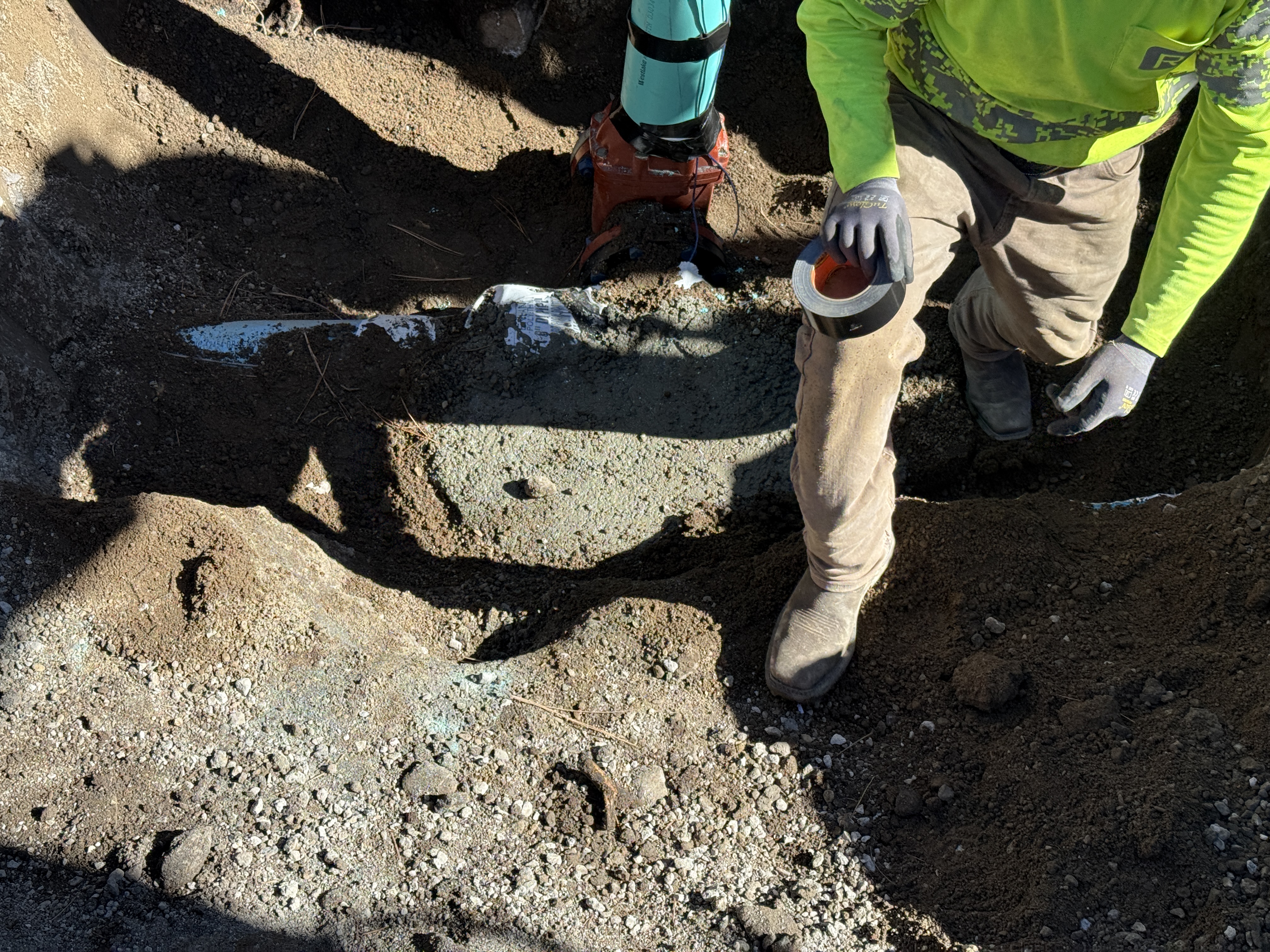 The image shows a worker holding a roll of duct tape, positioned on the right side of the frame near an exposed section of ground. Visible are soil mounds and a section of what appears to be a pipe or conduit partially buried. The worker is wearing gloves and is kneeling by the area. There is no machinery visible in the frame, and it's unclear what specific work is underway.