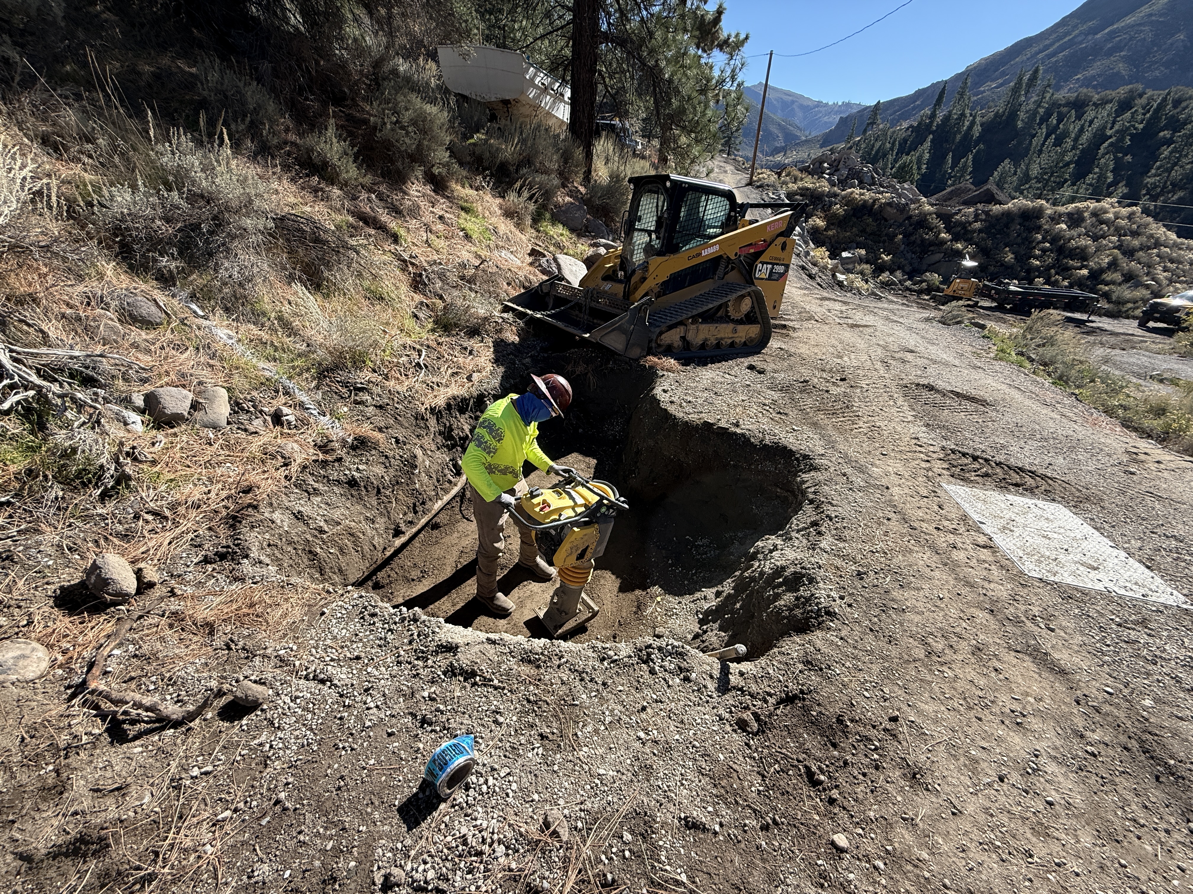 The image shows a construction worker using a compactor inside a trench, indicating compaction work. To the right, a compact track loader is parked on the edge of the dug area. The surroundings include dirt and gravel with a backdrop of trees and hills, suggesting an outdoor site with uneven terrain.