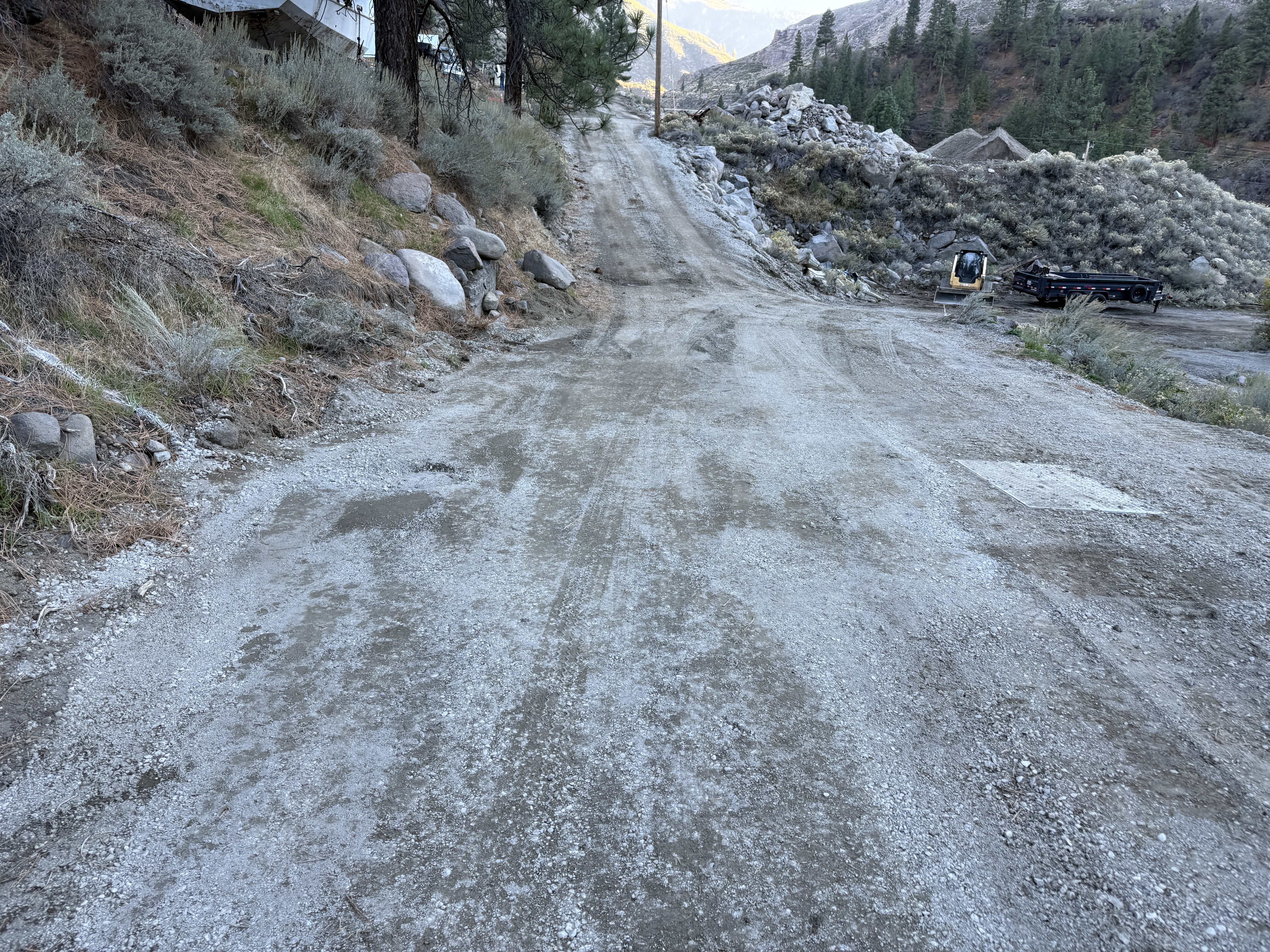 The image shows a dirt road being graded, with scattered rocks and vegetation on the sides. A compact excavator is placed on the right side of the image alongside a parked flatbed trailer, suggesting grading or earth-moving activities. The environment is mountainous and semi-wooded. No active human presence or construction workers are visible in the frame.
