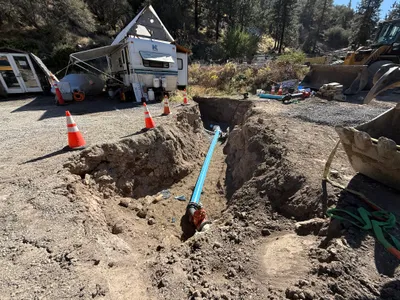 Safety cones are visible marking the trench, but no personal protective equipment is visible in the frame.