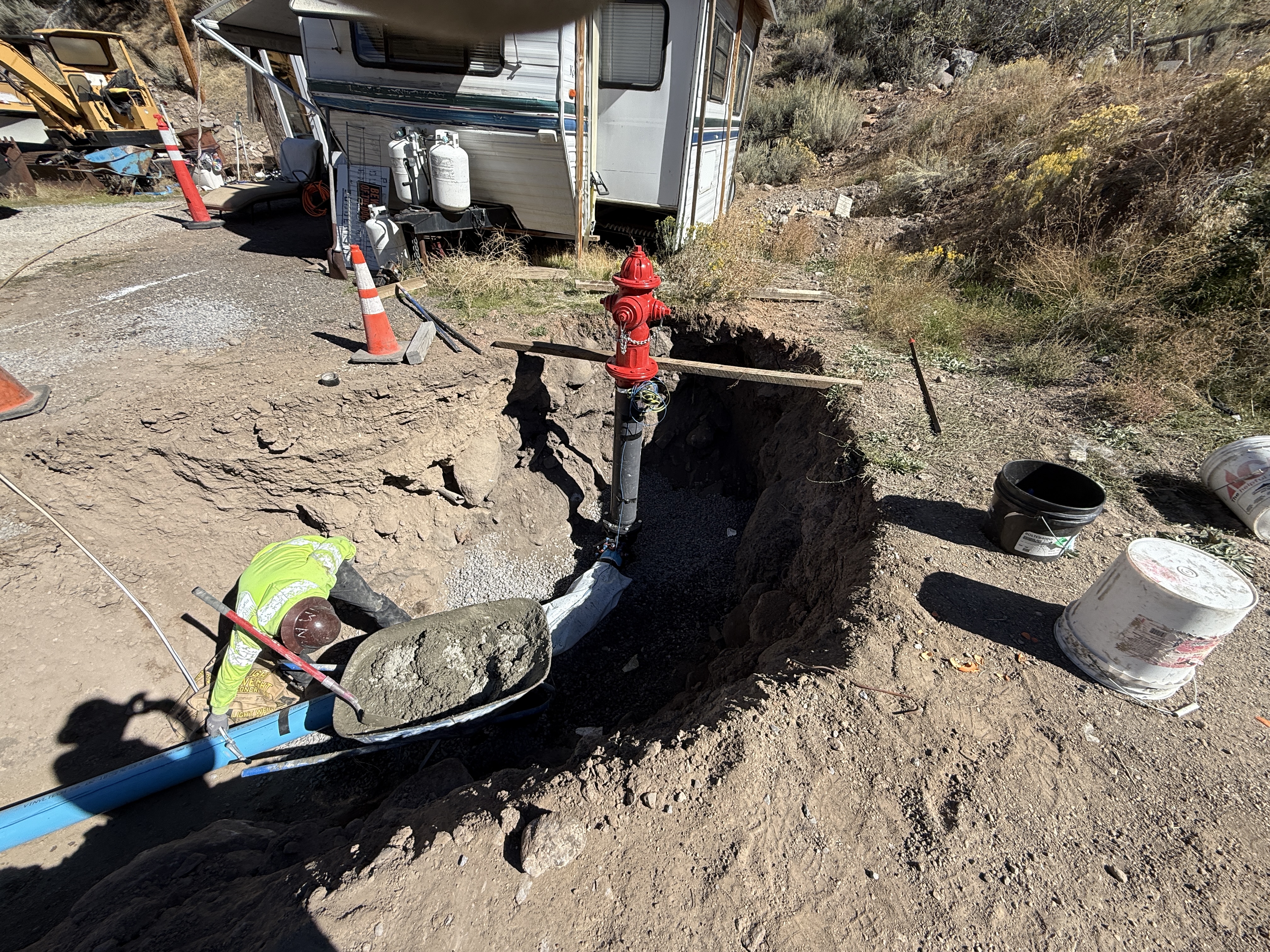 The image shows a construction site where a fire hydrant is being installed. A visible trench contains a red fire hydrant connected to a blue pipeline. A worker in a hard hat and hi-vis vest is seen handling concrete mix next to the hydrant. Several traffic cones and a wheelbarrow with cement are also visible around the site.