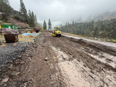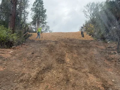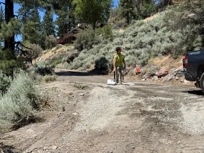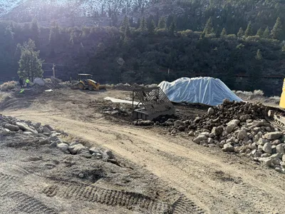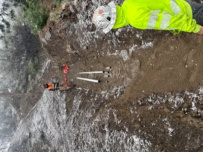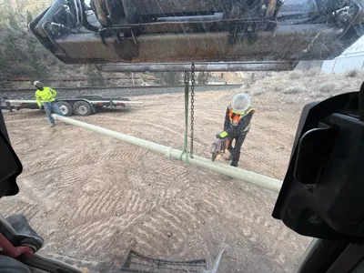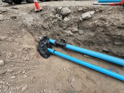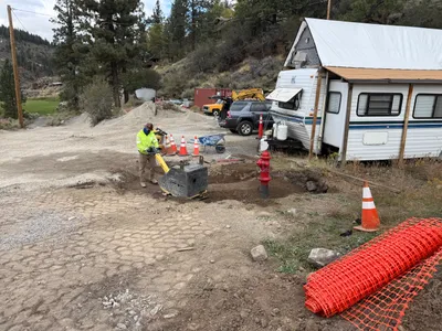 The image shows an excavation site with a trench being dug alongside a camper. A skid-steer loader is parked near the trench, and a blue pipe is visible, likely for a fire hydrant. Construction cones and orange fencing are placed around the site, indicating safety measures. The scene is set on a dirt surface with trees and hills in the background.
