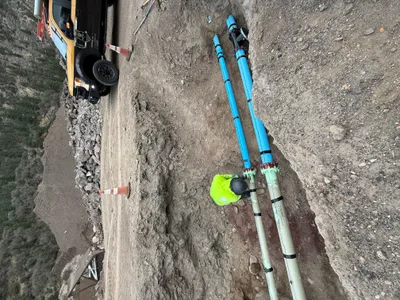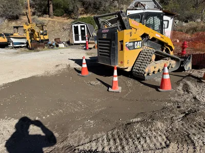 The image shows a fire hydrant surrounded by an orange safety fence, indicating that installation or maintenance work is underway. Two bright orange cones are placed adjacent to the hydrant inside the fenced area. A piece of heavy construction machinery with a front attachment is located to the left of the frame. The RV or trailer in the background suggests a temporary work site setup. Safety measures such as the fencing and cones indicate awareness of on-site hazards.