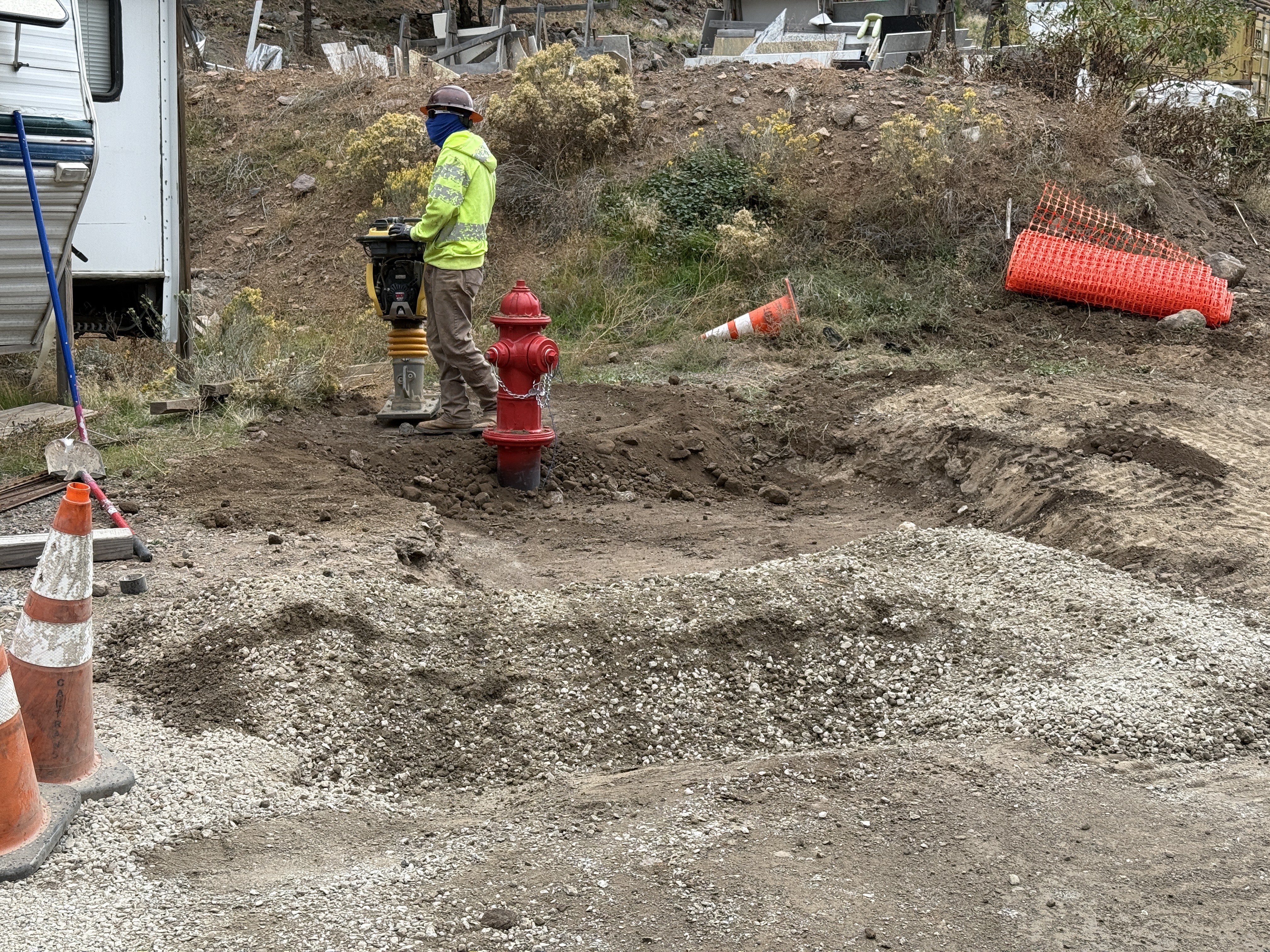 The image shows a construction worker using a compactor on a grassy area. A red fire hydrant is installed nearby, surrounded by disturbed soil and gravel. There are traffic cones and orange safety fencing on the ground. The worker is wearing personal protective equipment.