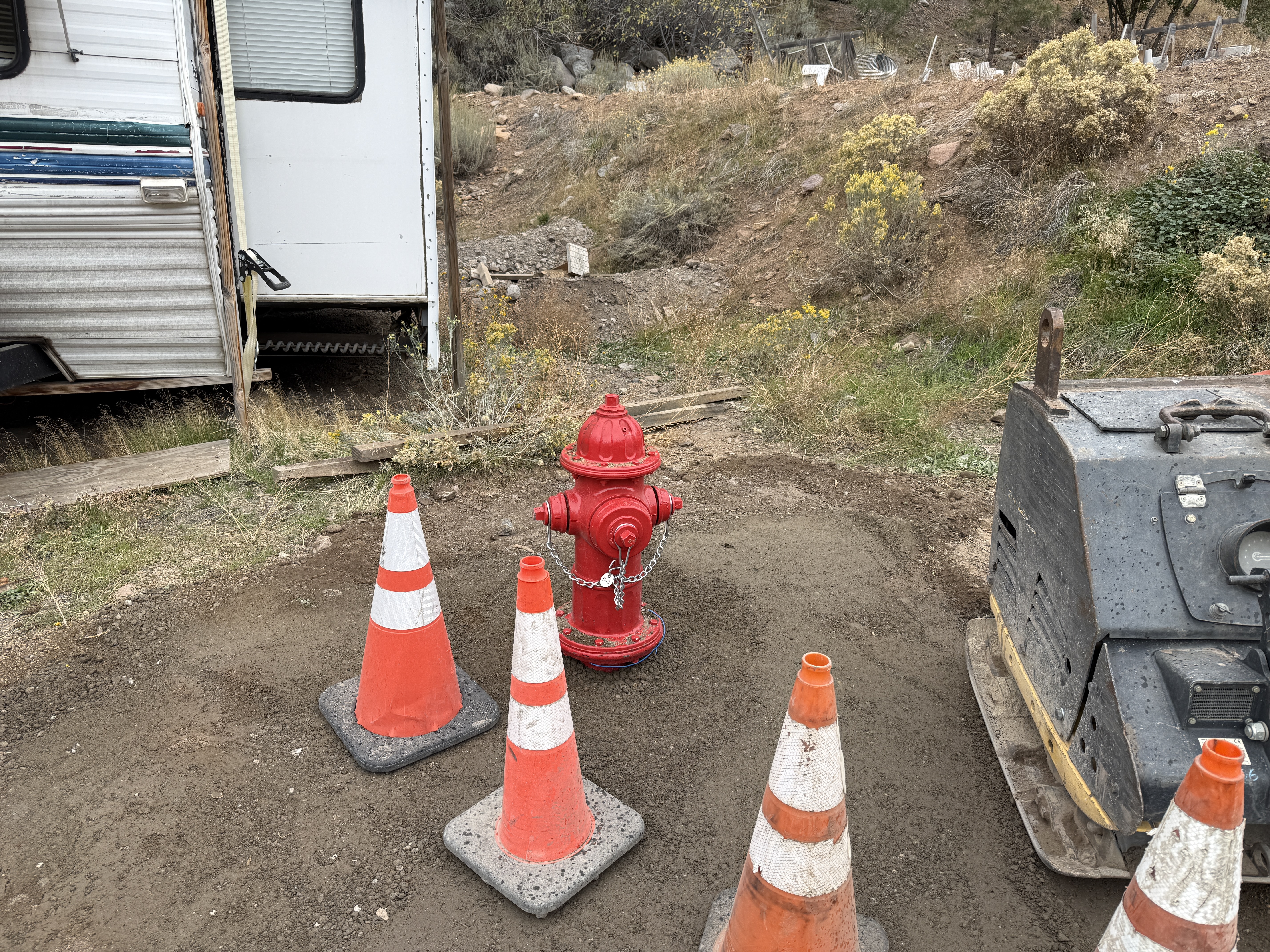 The image shows a red fire hydrant encircled by four orange traffic cones. A trailer is positioned to the left, and a piece of heavy machinery is to the right. The area is unpaved with visible dirt and sparse vegetation in the background, suggesting ongoing or planned utility work around the fire hydrant.