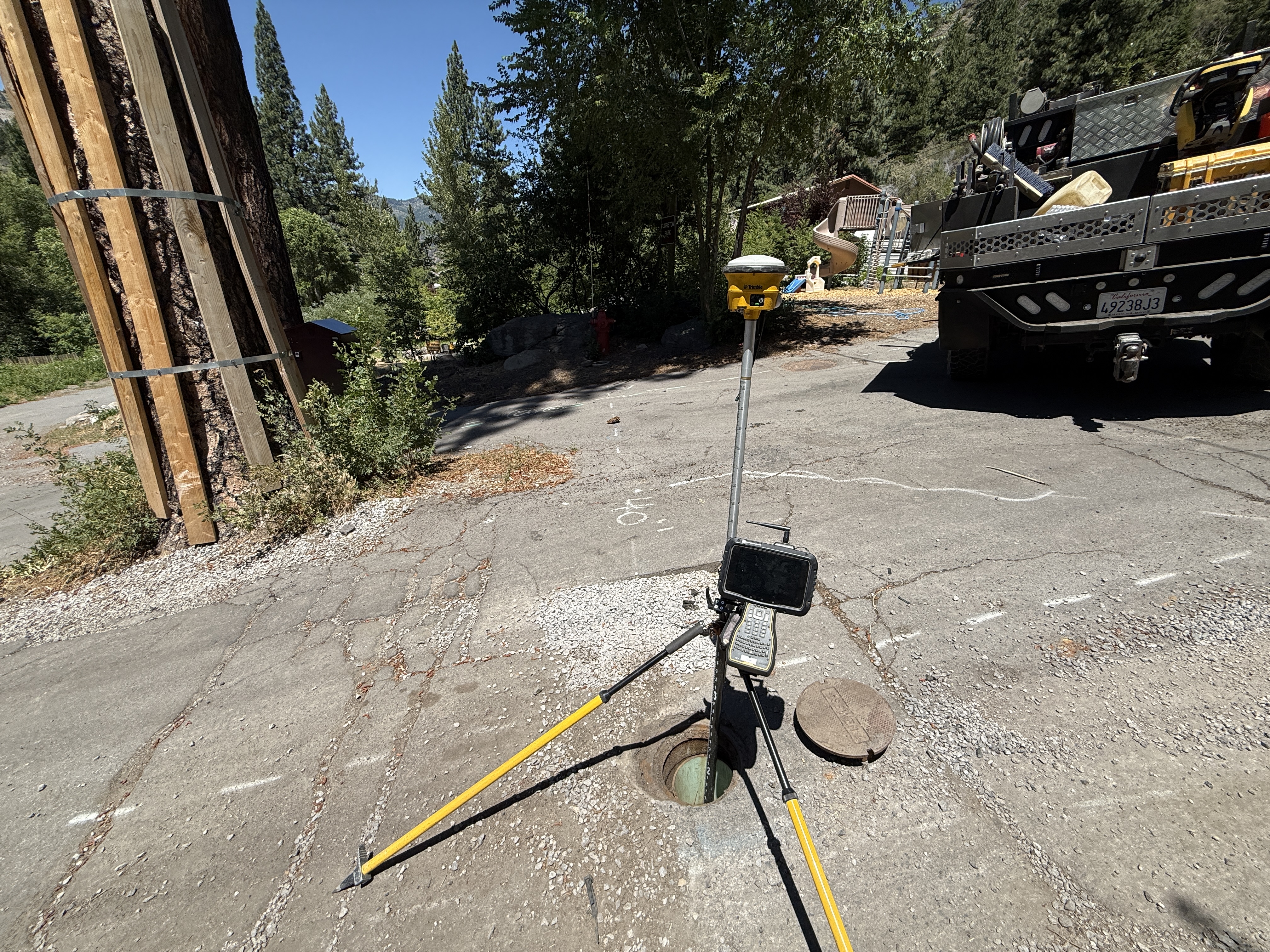 The image shows a survey setup with a tripod-mounted device positioned over an open manhole on a paved surface. To the left, a large tree is supported with wooden braces. A utility truck is parked nearby, partially visible. There is no visible activity of workers in the frame.