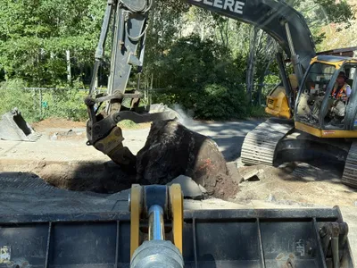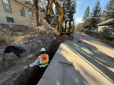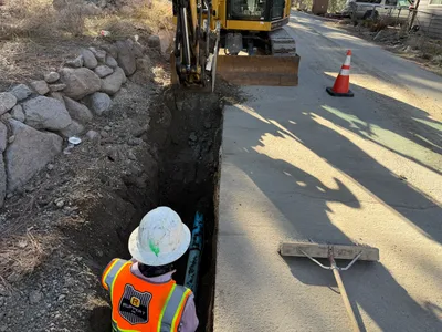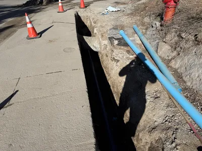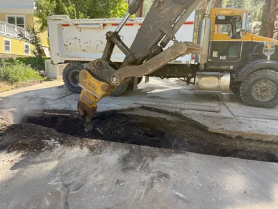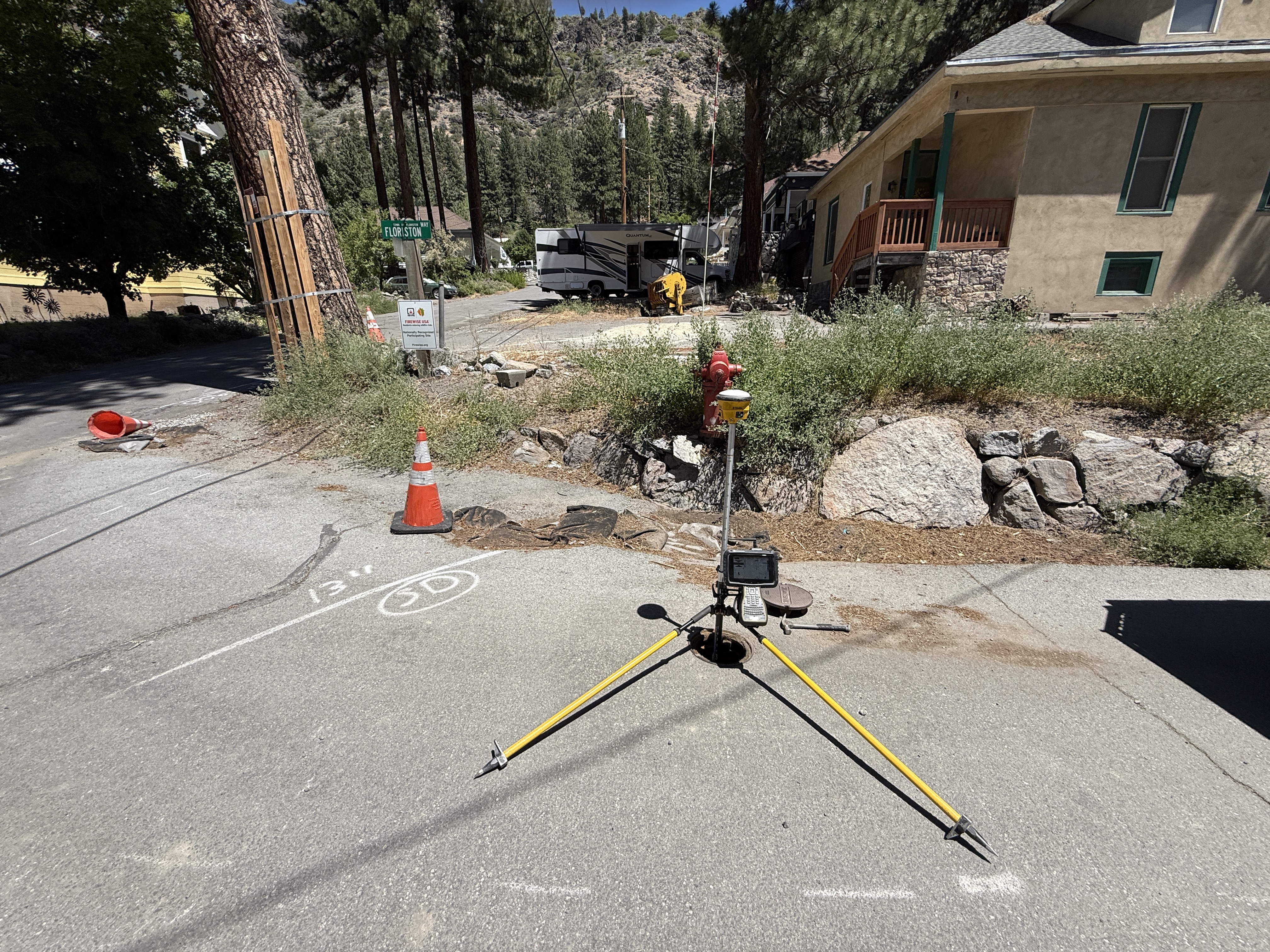 The image shows a survey tripod with an electronic device set up on a pavement near a fire hydrant. Two traffic cones are placed on the ground near the survey equipment. There's visible pavement chalk marking and a tilted traffic cone on the left side. Surrounding vegetation and rocks are present near a house and along the sidewalk.