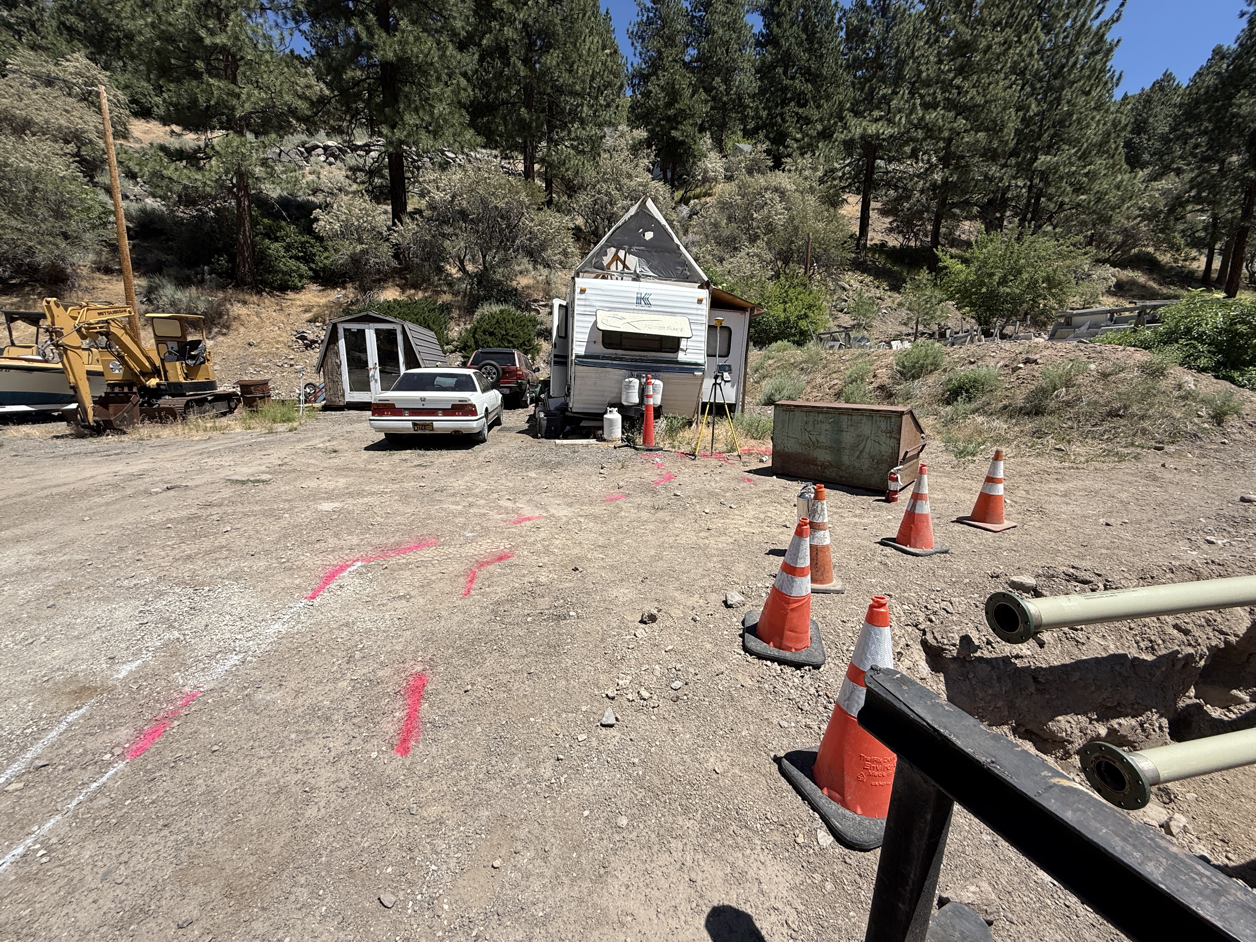 The image shows a job site with construction activity signified by pink marking paint and traffic cones on the ground. There is a trench being excavated, observable on the right side of the image. Heavy equipment, including an excavator, is present on the left. Vehicles, including a car and an enclosed trailer, are parked nearby.